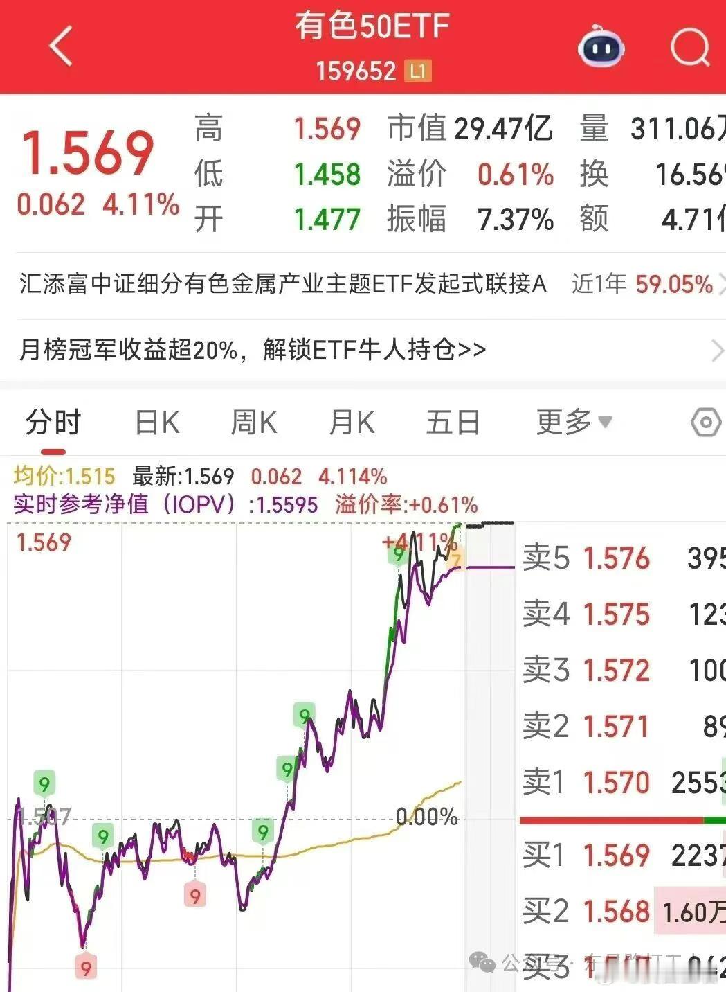 核聚变超预期,虽然业绩出来还要很久,但毕竟也是个中美共振,与市场调整的时候走强,后面高看一眼。有色今天mvp当之无愧,他可攻可守,是真正的全能选手,可称为本轮AI牛市的副goat。川普搞事情稀土和黄金涨,小登的AI涨拉动铜需求,中登的新能源绕不开锂矿和钴,老登的消费起来那顺周期的工业金属要先涨。有色50ETF(159652)稳如泰山,背后逻辑是平衡布局工业金属(铜、铝)、新能源金属(锂、稀土)和黄金,兼具周期性与成长性。