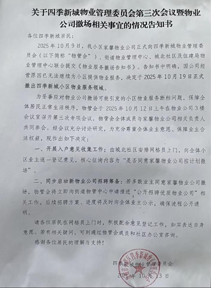 城北被水淹的网红小区,四季新城物业发公告要撤场,业主:很多问题都还没解...