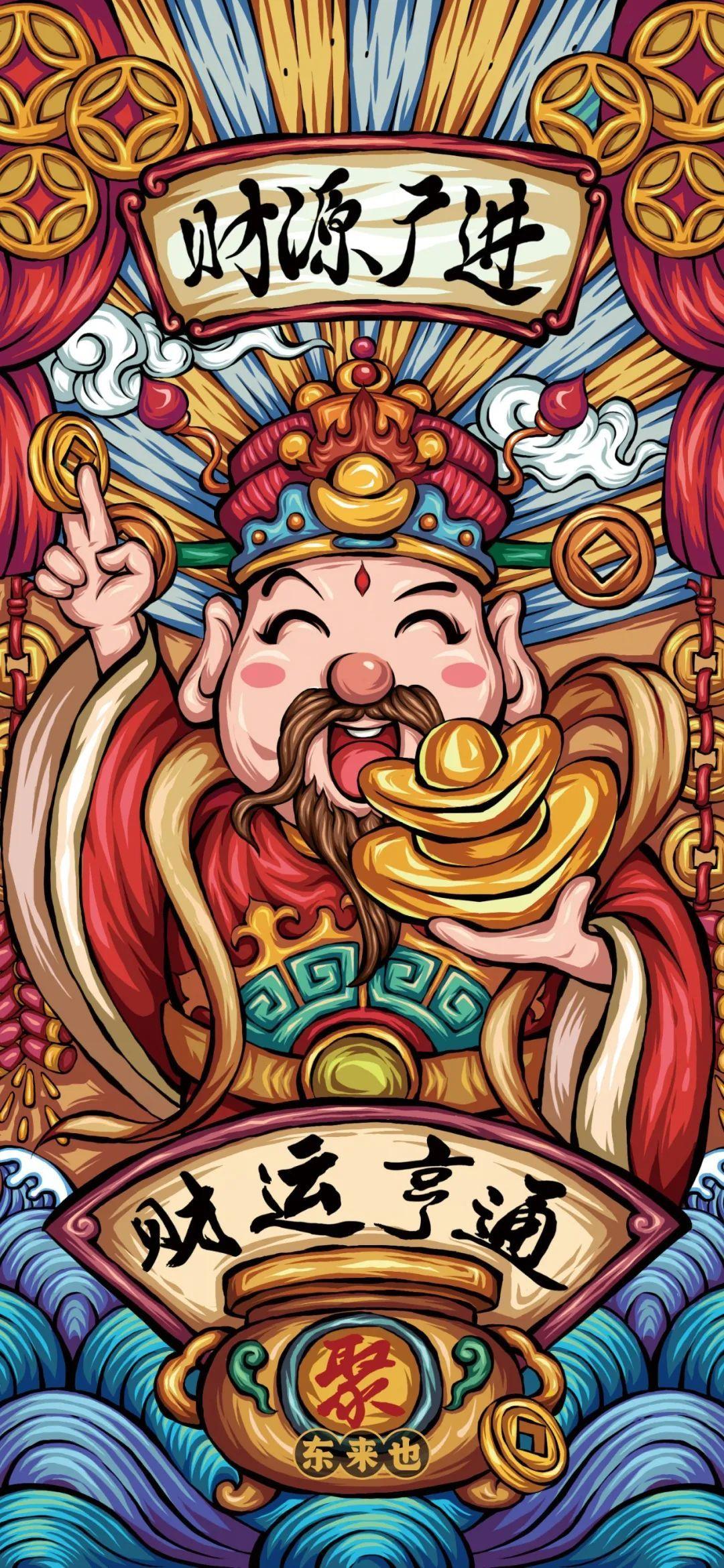 换新壁纸啦! 低饱和红金配色,喜气却不刺眼。福禄寿与财神依次探头,元宝、红包小细节很灵动;右侧竖幅金字“顺风顺水顺财神”,像把好运贴进屏里。整体热闹又可爱,每次点亮都被治愈。 暖色调的国潮插画,年味满满的治愈系。 手机壁纸 暖色调 插画 治愈系