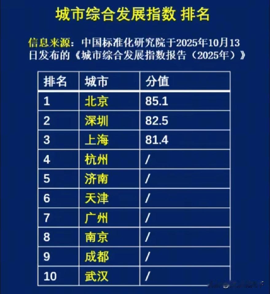 北京,深圳,上海3市,是中国城市群的领头羊 综合国家级媒体报道,我国首份《城市综合发展指数报告(2025年)》10月13号发布,北京,深圳,上海位居前三。 这份报告里,中国前十城市分别是:北京,深圳,上海,杭州,济南,天津,广州,南京,成都,武汉。 其中深圳排名超越上海,位居第二,上海排名第三,杭州位居前四,济南位居第5,天津位于第6,广州排名第7,南京位居第8,成都和武汉分别是第9名和第10名 这份报告发布者为中国标准化研究院,隶属于国家市场监督管理总局,是国家级社会公益类科研机构,主要开展标准化发展战略、基础理论、原理和方法标准体系研究等,还是具有一定的权威性的全国城市排行榜 国内城市排行 上海城市地位 国内城市排名 中国城市知名度 一线城市的实力 中国前8城市