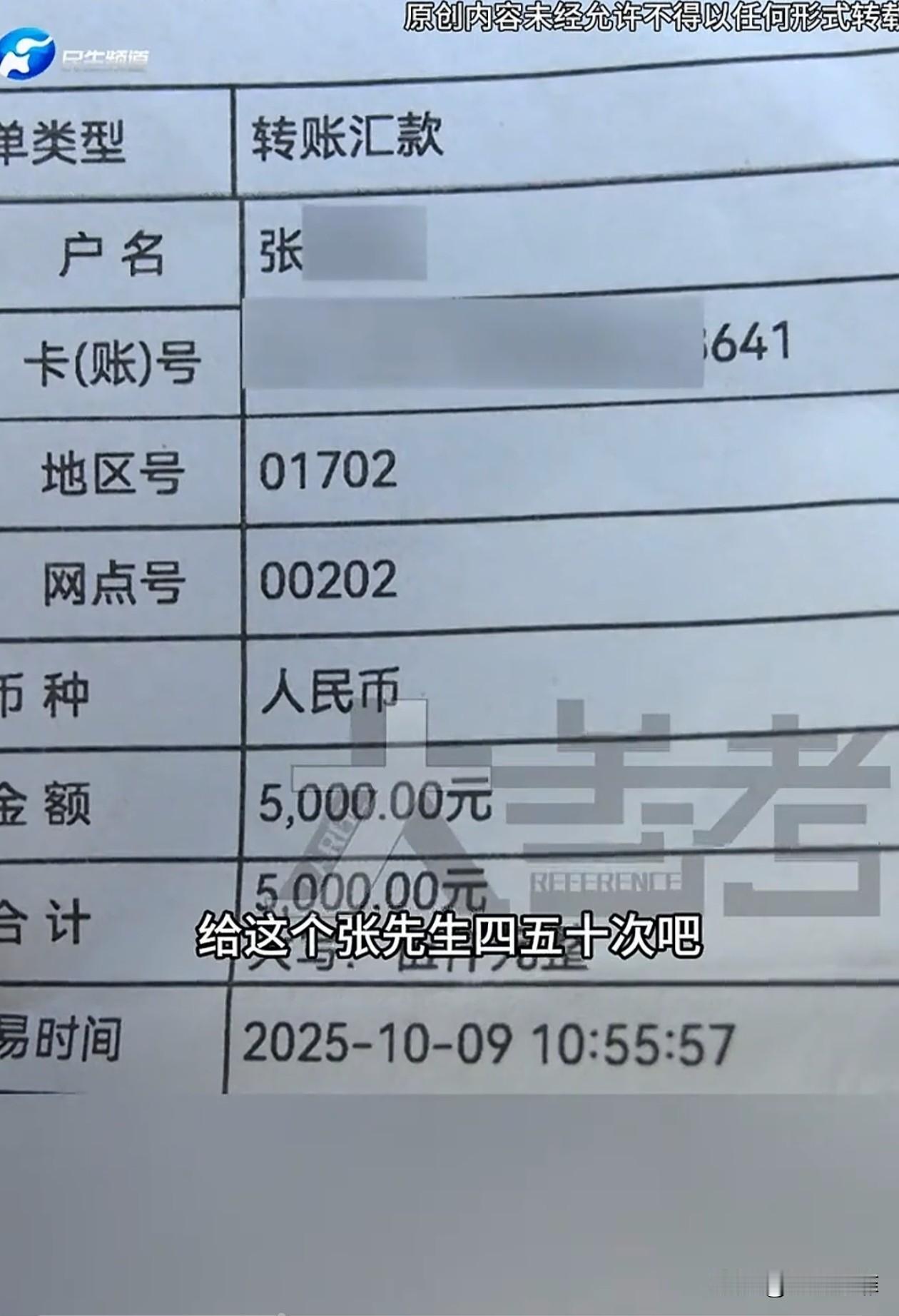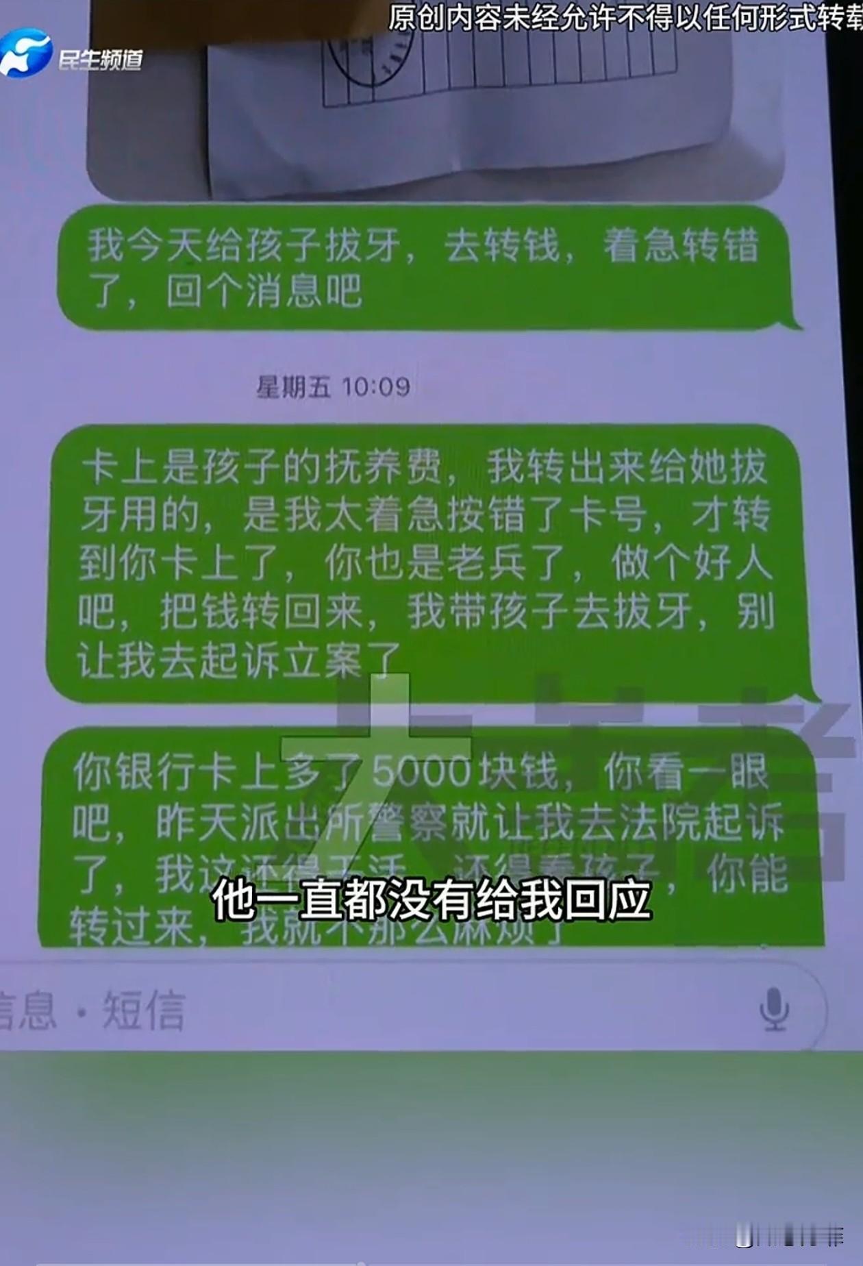 42岁的单亲妈妈,想把女儿卡里的500元抚养费转到自己卡上,给孩子看病用,却因心急大意多按了个0,把5000元转给了账户只差一位数的男子账户中。妈妈:给男子打了四五十通电话,发了10条信息,都联系不上。 河南,妈妈想转500元到自己卡上,给女儿拔牙用,结果因为着急,不小心输错了卡号,还多按了一个0,把5000元转到了陌生男子账户中。 发现转错后,她第一时间通过转账平台给收款人发消息,说明了情况,但没人回复,她又打了四五十通电话,也没人接。 之后她跑到银行咨询,工作人员说,需先核实对方身份信息,走流程需要时间,没办法立即冻结或追回这笔钱。 妈妈说,因为钱交不上,当时孩子病都没看,直接回去了,自己非常自责,希望男子看到能联系自己。 目前,这位妈妈仍在银行和警方的协助下联系收款人,希望对方能把钱还回来。 有网友完全站在单亲妈妈的角度,很心疼她,独自一人带孩子不容易,压力也大,这5000元对她来说非常重要。 也有网友认为,陌生人平白无故收到一笔钱,正常人第一反应都会疑惑,而男子却选择沉默,可能是想把钱据为己有。 转账汇款时,一定要仔细,看清楚再转,避免类似事情发生。希望这位妈妈能成功拿回自己的钱。