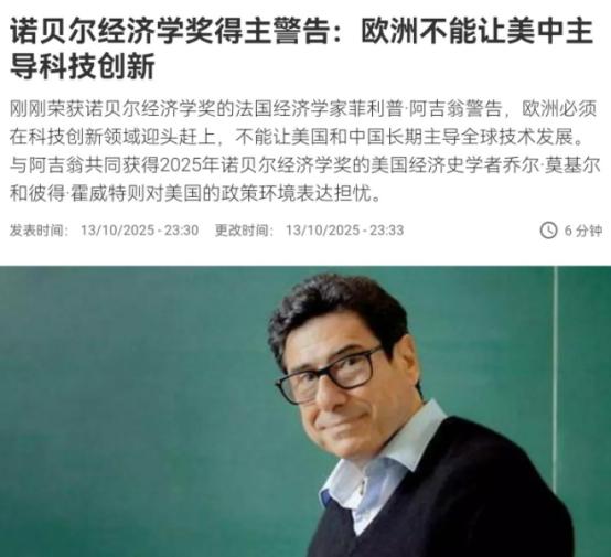 要向中美两国学习,新科诺贝尔奖经济得主警告欧洲,欧洲已经明显落后于中美两国!10月14日,新科诺贝尔经济学奖获得者来自于法国巴黎高等师范商学院的教授阿吉翁表示,当前全球经济正处在一个关键拐点,人工智能、生物科技与绿色能源将决定未来增长格局,但欧洲在创新与产业政策上的保守立场,已使其在与美中竞争中明显落后。 他特别提到,去全球化浪潮和各国竖起的关税壁垒,正在成为全球经济增长的最大障碍。市场的本质就是越大越有活力,只有足够大的市场空间,才能让思想碰撞出更多火花,让技术获得更快迭代,让竞争推动行业不断升级。任何试图限制开放、收缩市场的政策,本质上都是在给自己的增长挖坑,欧洲这些年在这方面吃的亏已经不少了。 阿吉翁认为,欧洲落后的根源,就出在创新和产业政策的保守上。现在中国和美国都在努力平衡市场竞争与产业扶持的关系,既不搞完全放任的自由竞争,也不搞过度干预的保护主义,而是用精准的产业政策为创新铺路。比如美国在芯片和新能源领域的巨额补贴,中国在人工智能和生物制药领域的长期布局,都是这种平衡思维的体现。 可欧洲却走了相反的路。它一直抱着“竞争政策”的名头不放,把任何形式的产业扶持都当成洪水猛兽,生怕破坏了所谓的“市场公平”。结果就是,欧洲的科技企业在面对中美巨头时,既没有政策支持,也没有资金优势,只能在竞争中慢慢失去话语权。比如在新能源汽车领域,欧洲本土品牌原本有先发优势,可现在中国新能源车凭借性价比和技术创新抢占欧洲市场,欧洲才急着搞补贴,可惜已经错过了最佳时机。 再看人工智能领域,美国有OpenAI、谷歌这样的行业龙头,中国也有百度、科大讯飞等企业在核心技术上不断突破,两国还在AI人才培养和应用场景落地上下了大功夫。欧洲呢?除了少数几个科研机构还在坚持,几乎没有能拿得出手的头部企业,更别说形成完整的产业链了。这种差距不是一天两天造成的,而是长期保守政策积累的结果。 生物科技领域的情况也差不多。中国在基因编辑、细胞治疗等前沿技术上的进展速度,让全球都为之侧目,美国更是凭借强大的资本和科研实力占据着领先地位。欧洲虽然有不错的科研基础,却因为审批流程繁琐、政策支持不足,很多好的技术成果没法快速转化成产品,最后要么被中美企业收购,要么就慢慢被市场淘汰。 绿色能源原本是欧洲的强项,早年在风电、光伏领域,欧洲企业一度引领全球。可现在呢?中国已经成为全球最大的光伏产品生产国和出口国,美国也在通过《通胀削减法案》大力扶持本土新能源产业。欧洲却因为能源危机和政策摇摆,不仅没能保住优势,反而在新能源产业链上处处受制于人,连本土的能源需求都要依赖外部供应。 阿吉翁强调,欧洲现在面临的不是简单的增长放缓,而是可能被排除在全球核心产业链之外的危机。如果还抱着过去的保守思维不放,不向中国和美国学习平衡竞争与产业政策的经验,不加大对创新领域的投入,欧洲只会在接下来的全球竞争中更加被动。 他举例说,中国在推动产业升级时,既重视市场的决定性作用,也会通过政策引导资源向关键领域集中,比如在半导体领域,中国用十年时间从依赖进口到逐步实现自主可控,靠的就是这种精准的产业布局。美国虽然崇尚自由市场,但在关键技术领域从不含糊,动辄几百亿美元的补贴,就是为了确保自己的领先地位。 可欧洲却总在“要不要扶持产业”的问题上纠结。担心政府干预会破坏市场规则,又怕不干预会让企业失去竞争力,这种左右摇摆的态度,让欧洲在面对中美竞争时毫无还手之力。比如在芯片制造领域,欧洲原本有ASML这样的核心企业,可在芯片设计和制造环节却严重缺失,等意识到问题想补课的时候,中美已经形成了完整的产业链,欧洲再想追赶就难上加难了。 阿吉翁最后警告,现在全球经济的竞争已经进入了“淘汰赛”阶段,人工智能、生物科技和绿色能源这三大领域,容不得任何犹豫和拖延。欧洲如果还不改变保守的政策立场,不主动向中国和美国学习先进的产业发展经验,继续被“竞争政策”的条条框框束缚,那么未来不仅会失去经济增长的动力,还可能彻底失去在全球经济格局中的话语权。毕竟在当下的全球竞争中,不进则退,慢进也是退,欧洲已经没有太多时间可以浪费了。