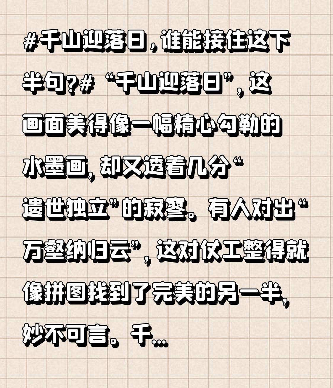 千山迎落日,谁能接住这下半句? “千山迎落日”,这画面美得像一幅精心勾勒的水墨画,却又透着几分“遗世独立”的寂寥。有人对出“万壑纳归云”,这对仗工整得就像拼图找到了完美的另一半,妙不可言。千山在落日余晖的映照下,宛如一群彬彬有礼、躬身揖别的君子;万壑呢,恰似敞开衣襟、潇洒归隐的隐者。山迎落日,那是瞬间爆发的壮美,如同绚烂烟花;壑纳归云,是细水长流的永恒慈悲,好似温暖炉火。这意境,就像王维诗里藏着的禅机,让人越琢磨越有滋味。 其实这可不只是简单的诗句对接,更像是一场关于人生的深度“头脑风暴”。“千山”就像人生路上密密麻麻的挑战,像一群张牙舞爪的小怪兽;日落则寓意着稍纵即逝的美好瞬间,如同流星划过夜空。谁能稳稳接住这落日的馈赠,就看谁有“初生牛犊不怕虎”的勇气,去追逐光与影,书写属于自己的人生诗章。