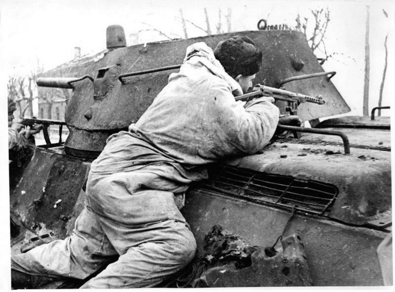 二战中的苏联列宁格勒,苏联红军士兵在坦克后手持冲锋枪与德军激战中。
