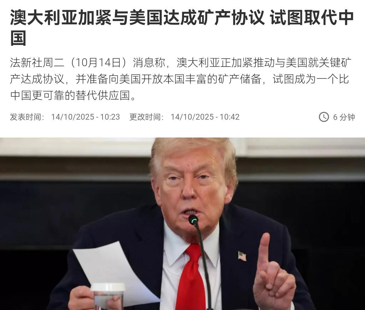 澳大利亚站队美国,声称将加紧与美国达成矿产协议,取代中国地位!10月14日,根据