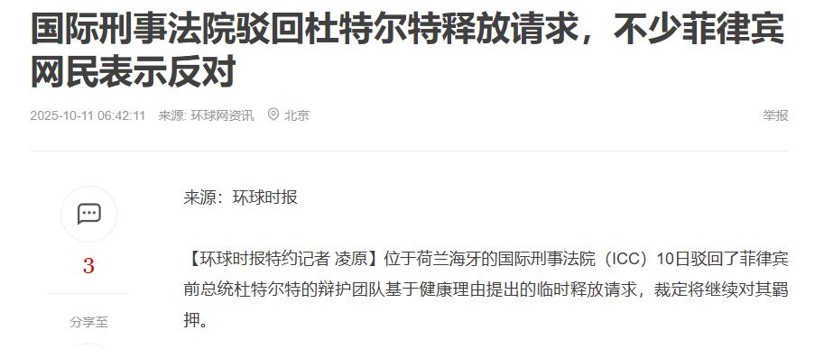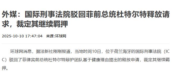 据环球时报报道:国际刑事法院驳回杜特尔特释请求,不少网民表示反对。 10 月 10 日,国际刑事法院正式驳回老杜因为健康理由提出的释放申请,裁定继续进行羁押,ICC 的裁判文书上写的很明白 “对杜特尔特的拘留仍是必要的。” 这句话看似简单,实则堵死了老杜短期内回国的所有可能。 ICC给出的理由很直接,一方面是杜特尔特存在潜逃风险,毕竟他女儿莎拉是现任菲律宾副总统,手里握着实实在在的政治人脉和支持网络,ICC担心这些力量会成为老杜逃脱的助力; 另一方面,辩方提交的所谓认知能力衰退医疗报告根本站不住脚,法院压根不认可这能成为保释的理由。 其实在这次驳回前,莎拉确实想过打“悲情牌”救父。她对外爆料说父亲在拘留所晕倒,海牙方面还没第一时间通知家属,借着这事指责对方缺乏人文关怀,想以此重新申请释放。 这招在菲律宾国内或许能赚点同情分,但ICC不吃这一套,毕竟他们手里握着更硬的筹码。老杜身上背着70多项罪名,其中包括3项反人类罪,还涉嫌参与至少76起谋杀案,这些指控都和他任内的“禁毒战争”有关。 早在2018年ICC就盯上了这场行动,即便菲律宾2019年退出了ICC,也没能阻止调查继续推进,2025年3月老杜从境外回马尼拉机场时,直接被警方拿着ICC逮捕令拘留,这背后少不了小马科斯政府的默许甚至配合。 杜特尔特家族的困境远不止老杜被拘这一件事,作为家族的核心继承人,副总统莎拉正面临参议院的弹劾审判,罪名从违宪、腐败到涉嫌谋划暗杀总统,足足好几项重罪。 按照菲律宾宪法,弹劾高级官员需要24名参议员中的16票赞成才能定罪,这意味着莎拉必须至少争取到9票支持才能保住政治生涯。 虽然5月的中期选举里,杜特尔特家族支持的候选人拿下了5个参议院席位,老家达沃市甚至把身陷囹圄的老杜第八次选上市长,让外界以为他们还有翻盘的希望,但这些优势其实很脆弱。有政治学教授就直言,候选人现在和莎拉结盟,不代表审判时真会投赞成票,参议院的态度还很难说。 更要命的是,小马科斯的表弟、众议长马丁·罗穆亚尔德斯正全力推动弹劾案,摆明了要赶尽杀绝。 反观小马科斯,这盘棋下得确实够狠,几乎把能出的牌都打光了。2022年他和莎拉组成“王子公主联盟”赢下大选,嘴上喊着“南北共治”,上台就把莎拉“发配”到教育部长的位置,悄悄削弱杜特尔特家族对军警系统的控制权。 2024年矛盾彻底爆发,老杜骂小马科斯是“瘾君子”,转年3月ICC就出手抓人,这时间点巧合得过分,明眼人都能看出是小马科斯在“借刀杀人”。即便中期选举后杜特尔特家族展现出残余势力,小马科斯也没松口,面对“先接回老杜再谈和解”的条件,他情绪激动连说七个“不”,把和解的门彻底关上。 他心里很清楚,一旦让步就等于承认自己之前配合ICC是错的,会动摇执政根基,而且美国也不希望两大家族和解——毕竟杜特尔特任内对华务实,小马科斯则在强化美菲军事合作,这背后的利益纠葛早就把老杜的回国路堵死了。 有意思的是,即便杜特尔特家族看着还有点家底,比如国会里有数十名议员、政界有数千名官员和他们有关联,达沃市的支持者还在搞抗议,但这些力量根本没法形成有效反击。 莎拉去海牙探监、计划搞和平集会,看着热闹却掀不起大浪。参议院之前以15票赞成通过决议,呼吁ICC释放老杜改为软禁,结果人家理都不理,显然知道这只是菲律宾国内的政治表态。 更讽刺的是,老杜虽然当选了达沃市市长,却只能让儿子塞巴斯蒂安代履职,自己连宣誓都只能在拘留所里想办法,这市长当得着实憋屈。 民调数据倒是能看出点门道,小马科斯的支持率从33%跌到19%,反对率高达57%,而莎拉的支持率升到42%,成了2028年总统大选的热门人选。 但支持率这东西在硬邦邦的权力斗争面前不值钱,只要弹劾案一天不结,莎拉就始终踩在钢丝上,小马科斯手里的司法武器随时能落下。 ICC那边更不会给杜家机会,毕竟他们认定老杜一旦回到达沃市就可能脱离控制,这种风险是国际司法机构绝不能接受的。 小马科斯已经把主动权牢牢攥在手里,弹劾莎拉的程序在推进,和ICC的默契还在保持,连美国这个背后靠山都站在他这边。 杜特尔特家族确实落到了下风,老杜的上诉能不能出现奇迹还是未知数,莎拉能不能在参议院的审判里保住自己的政治生涯更是悬而未决,菲律宾政坛这盘棋,现在的主动权早就不在杜家人手里了。 信息来源:环球网——国际刑事法院驳回杜特尔特释放请求,不少菲律宾网民表示反对 环球时报——外媒:国际刑事法院驳回菲前总统杜特尔特释放请求,裁定其继续羁押