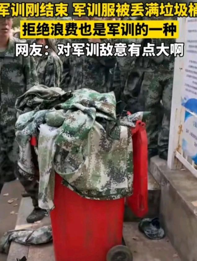 每年的军训结束, 垃圾桶旁就扔满了军训服, 才穿了一周的衣服,说扔就扔了。 有人说,每年学校都扔出这么多的军训服,多么浪费啊,不过想起来也是没办法,学生平时也用不上军训服,就是开学用那么一周军训的时间,而且军训服的材料,一直是个迷,记得以前大侄子军训的时候,每次回来经过就一股汗夹着臭塑料的味,特别是那个军训鞋子,鞋底又硬又臭,侄子说过,很多同学穿过军训服都皮肤敏感了,只不过就穿一周多的时间,敏感就让他敏感吧。 这里就有个矛盾怕是永远解决不了,军训服质量差,回收再用怕是有健康的大问题,另一个就是衣服浪费的问题,全国每年都需要消耗一批新的军训服,每年都需要浪费,回收又不能回收,你们说咋办呢?