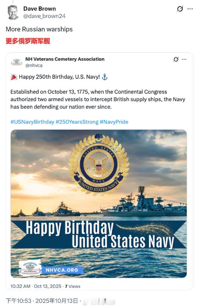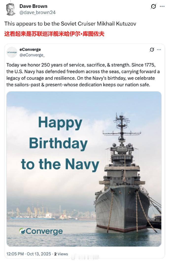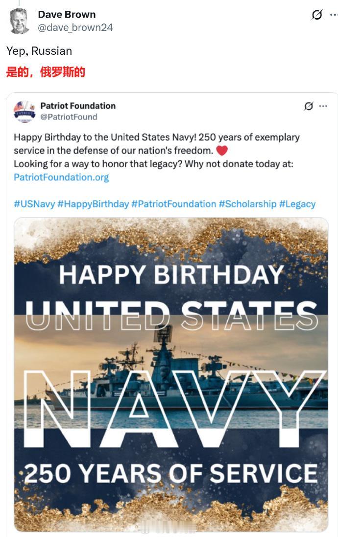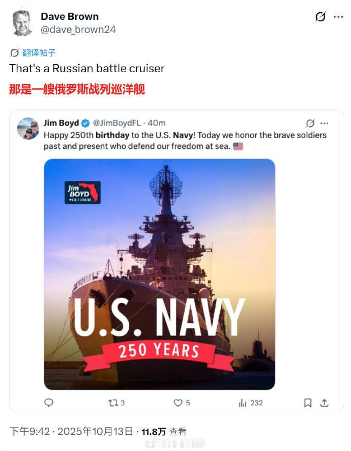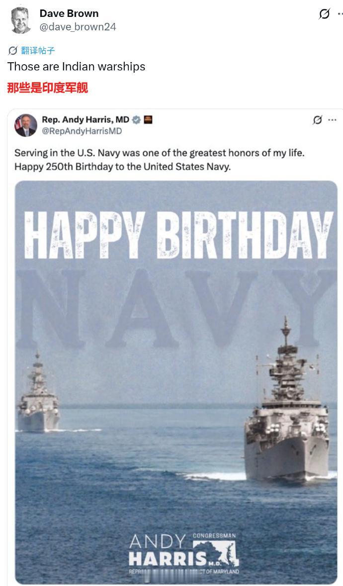 美国海军成立250周年纪念期间,美国多机构闹出二百五一样的笑话。 华尔街日报的外勤主任戴夫·布朗指出,多家美国机构和议员发布的庆祝海报上,用的都是外国军舰的照片这些机构和个人有: 美国海豹突击队博物馆发的海报是俄罗斯军舰(图1); 佛罗里达州参议员Jim Boyd发的庆祝海报也是俄罗斯舰艇(图2); 众议员安迪·哈里斯用的海报上是印度舰艇(图3); 美国退伍军人公墓协会用的海报还是俄罗斯舰艇(图4); 美国爱国者基金会用的依然是俄罗斯舰艇(图5) 美国国防、航天制造商丹尼尔斯制造公司 (DMC)发布前苏联的(图6) 专注于军事与科技新闻的Team Orlando News发的军舰是丹麦的(图7) 其他还包括:州众议员凯尔·多纳休(发了印度舰艇)、 州众议员阿尔文·文卡特(也是印度舰艇), 佛罗里达第 19 选区共和党国会候选人——退伍老兵迈克·彼得森(发了前苏联巡洋舰), 州众议员乔希·西格尔(发了印度舰艇), 北卡罗来纳州金斯顿市市长唐·D·哈迪(发了日本军舰)、 美国众议院议员胡安·西斯科马尼(用了印度的)。 还有很多无关紧要的机构或个人,我都懒得贴了……