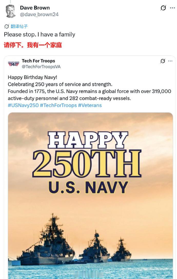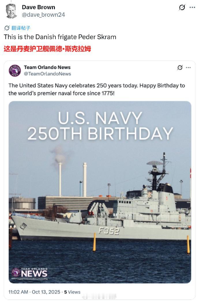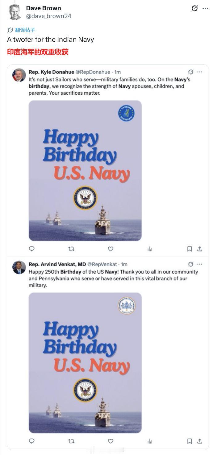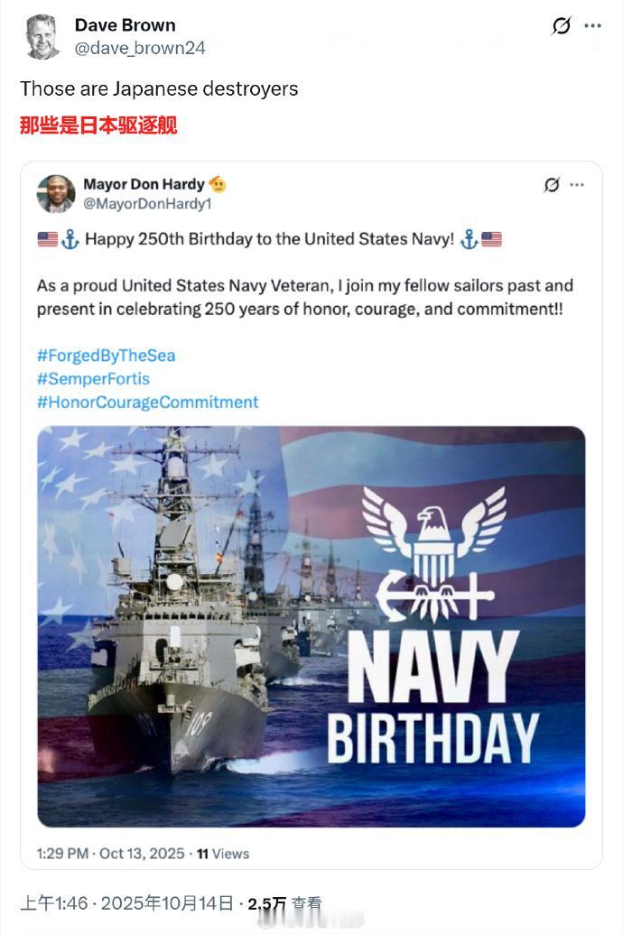 美国海军成立250周年纪念期间,美国多机构闹出二百五一样的笑话。 华尔街日报的外勤主任戴夫·布朗指出,多家美国机构和议员发布的庆祝海报上,用的都是外国军舰的照片这些机构和个人有: 美国海豹突击队博物馆发的海报是俄罗斯军舰(图1); 佛罗里达州参议员Jim Boyd发的庆祝海报也是俄罗斯舰艇(图2); 众议员安迪·哈里斯用的海报上是印度舰艇(图3); 美国退伍军人公墓协会用的海报还是俄罗斯舰艇(图4); 美国爱国者基金会用的依然是俄罗斯舰艇(图5) 美国国防、航天制造商丹尼尔斯制造公司 (DMC)发布前苏联的(图6) 专注于军事与科技新闻的Team Orlando News发的军舰是丹麦的(图7) 其他还包括:州众议员凯尔·多纳休(发了印度舰艇)、 州众议员阿尔文·文卡特(也是印度舰艇), 佛罗里达第 19 选区共和党国会候选人——退伍老兵迈克·彼得森(发了前苏联巡洋舰), 州众议员乔希·西格尔(发了印度舰艇), 北卡罗来纳州金斯顿市市长唐·D·哈迪(发了日本军舰)、 美国众议院议员胡安·西斯科马尼(用了印度的)。 还有很多无关紧要的机构或个人,我都懒得贴了……