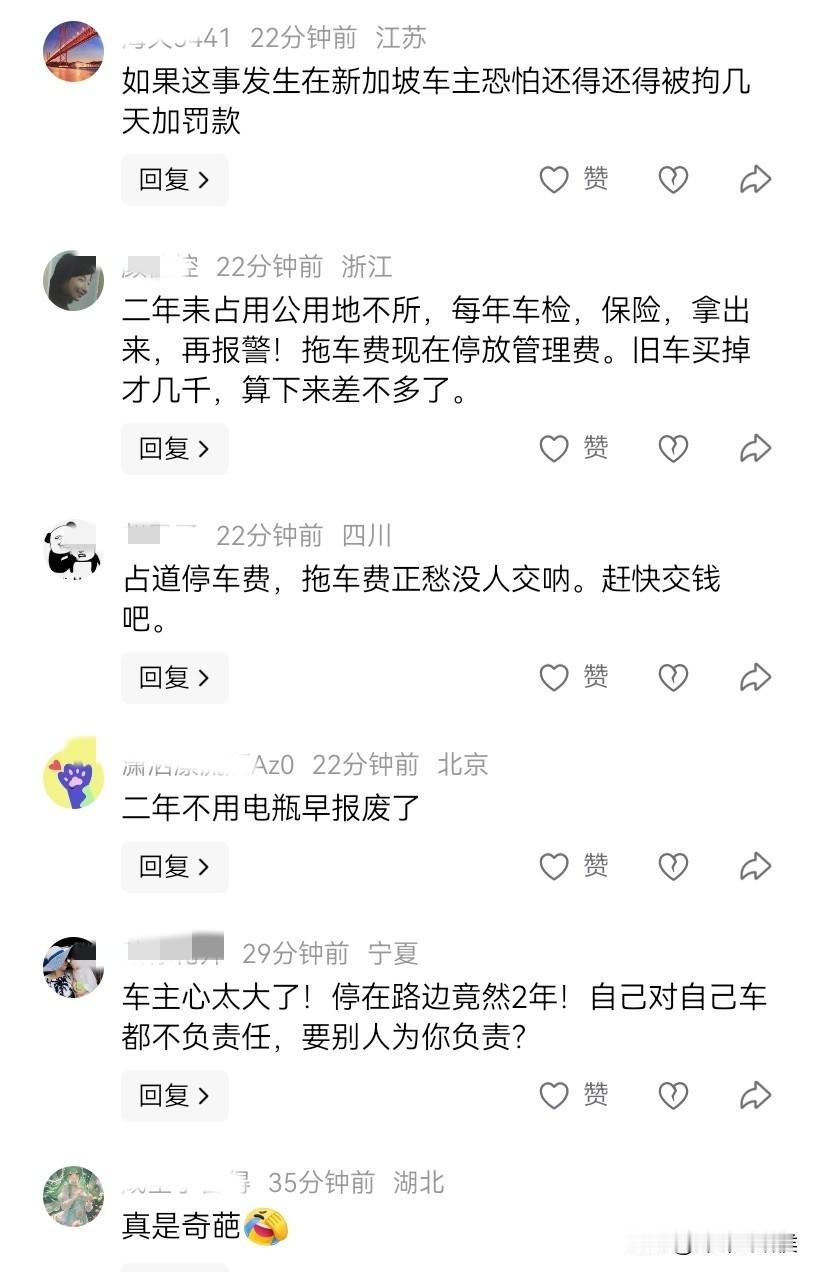 这位浙江男子,好生奇怪! 把车停路边2年,2年一次都没去看过,突然想起来要用车时,走过去一看,这回傻眼了。 原来车没了,路也不是原先的那条路了。 如果家里有好几辆车,把车闲置在路边不去开也不去管,还可以理解,而浙江这名男子家里又没有其他车辆,平时也就公交车和地铁出行,那么他为何要把车子停在路边,两年都不去关心一下呢? 环球日报报道了这一则有趣的新闻(图四),原来这位赵先生买的是一辆宝骏,当初花的钱也不多,4万块钱,车龄已经8年多了。 两年前,他把车停在杭州的某个街道路边,用他的话说,当时这个街道上也有很多车停在路边,他也就把车停在那里了。 后来,一年多都没去看,直到今年7月份他要用车了,赶过去一看傻眼了,这条路被修了,路口还有收费栏,他自己的车更是不见了踪影。 虽然车不值钱,但不能无缘无故失踪呀,于是赵先生就打了110报警电话,最终在警方的调查之下,终于找到他的这辆车。 他的车一年之前就被放在了当地的一个废旧停车场里了,车边边上长满了野草,看样子停这里的时间挺长(图二)。 赵先生看到了自己的车,本来想把车开走的,然而凑近一看,根本开不了,不仅车里的电瓶没了,连火花塞也丢了(图三)。 打电话咨询维修人员,需要五六千才能修好。 赵先生一想,这车才多少钱,维修费这么贵,虽然自己把车停在路边不对,但到底是谁把车子停到这里来的,电瓶之类又是怎么被偷的呢? 记者帮忙联系上了社区,社区说这条路都改了了一年多,修路之前先是贴了通知,后来路边的停车都打过电话了。 但是,赵先生说自己没有接到过电话,也没有在车上留过电话号码,这事又该怎么办,现在好好的一辆车开不了了。 停车场的看门人说(图一),这里都放着很久不开的车子,至于说赵先生的车什么时候电瓶被偷了,在哪里被偷的,自己是负责看管,换句话说,他也不知道这电瓶是在什么时候丢失的。 如今,谁都不愿负这个责任,难道要找保险公司?看来,闲置车辆还是不要随意停放陌生地方很长时间。 网友们对此也是议论纷纷(图五)。 最后,赵先生把车在路边两年不管不问,如今车内东西丢了,他的责任又有多大呢?