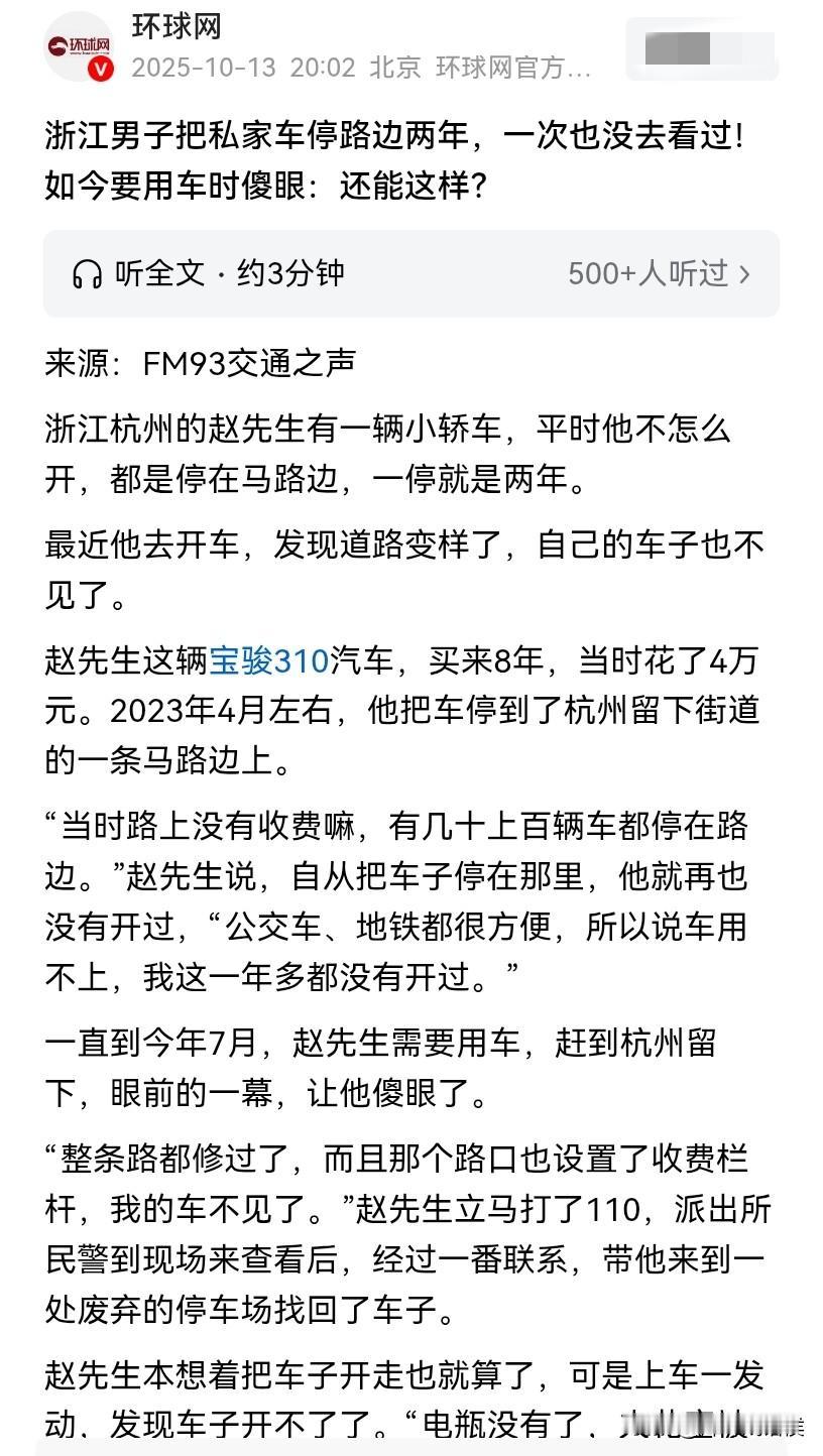 这位浙江男子,好生奇怪! 把车停路边2年,2年一次都没去看过,突然想起来要用车