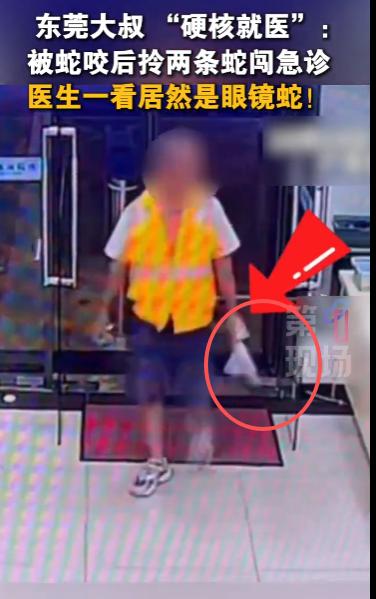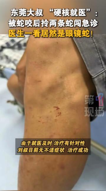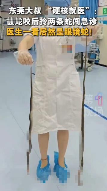 “离了个大谱!”2025年10月,广东东莞,一男子被蛇咬后“硬核就医”,拎着两条咬自己的蛇来了医院急诊,医生一看男子手里拎着的蛇,发现这居然是眼镜蛇!网友:这也太硬核了! 如果不慎被蛇咬伤,最好是记住蛇的身形样貌,这样的话医生能判断出蛇的种类,进行针对性的治疗,广东一名大哥牢记这一点,只不过他的做法令人惊掉了下巴。 一名男子不慎被毒蛇咬伤,他没有惊慌,被咬后男子第一时间将两条蛇给抓住,塞进了一个透明塑料袋里,随后提着袋子就往医院赶。 来到医院后,男子手中塑料袋里的蛇瞬间吸引了不少人的目光,他提着两条毒蛇直奔急诊说明自己的来意,医生接过塑料袋查看蛇的种类。 这不看不知道,一看在场的医生全都吓了一跳!这两条毒蛇正是大名鼎鼎的眼镜蛇,毒性较强,在了解了咬伤男子的蛇种类后,医生赶紧对症下药。 由于男子被蛇咬后就医及时,得知蛇的种类也让医生的治疗更加有针对性,男子目前身体已经没有大碍。 不少网友感叹男子是真“硬核”,不慎被蛇咬伤后尽量记住蛇的特征即可,可千万别学男子的行为,不是每个人都有捕蛇的技术,一不小心还可能被蛇多咬几口! 信息来源:《一大叔“硬核就医”引发关注,因网鱼时网到了两条蛇,并被其中一条咬伤,一怒之下,将两条蛇打死,拎着去医院就医。医生一看竟然是眼镜蛇!》第一现场