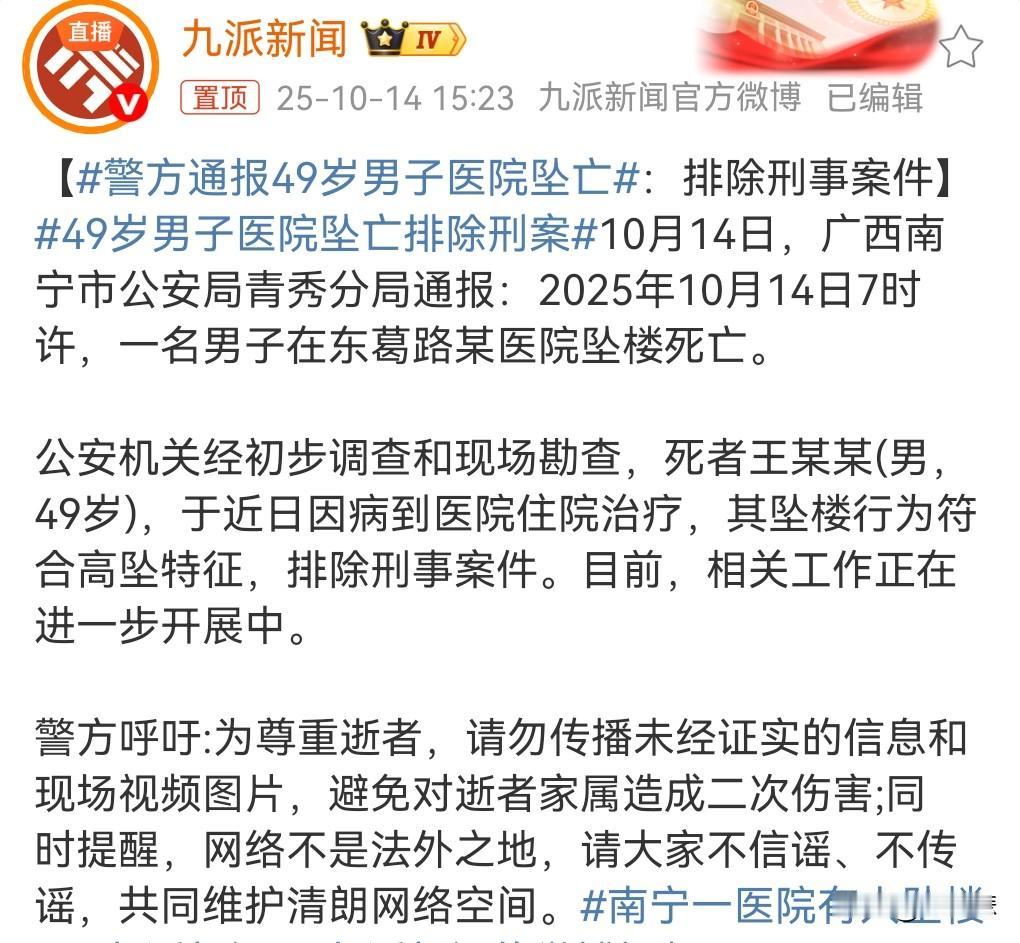 这年头寻死的人实在是不少,他们肯定是经历了内心的绝望,内心非常的痛苦,痛不欲生,所以才会轻生。 没有经历过这些的不会明白。 但无论我们面临什么样的困境,还是要坚强一点,虽然生活中有一句话叫医者难自医。 10月14日,广西南宁,一名49岁男子在医院高坠身亡,排除刑事案件。 人其实是非常脆弱的。