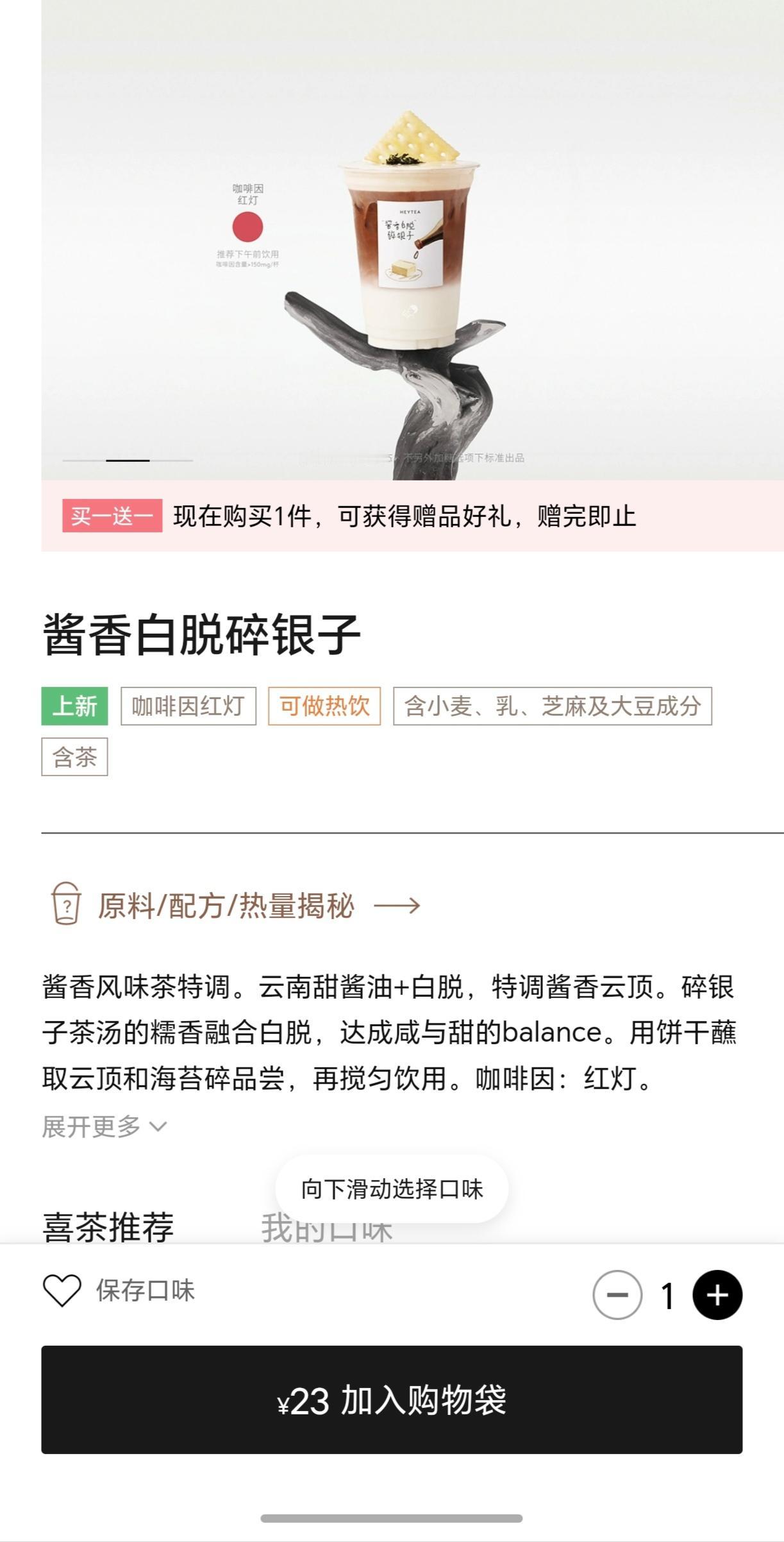 今天喜茶,23块钱一杯的酱香白脱碎银子,买一送一了。 明明点单上的照片超级好看