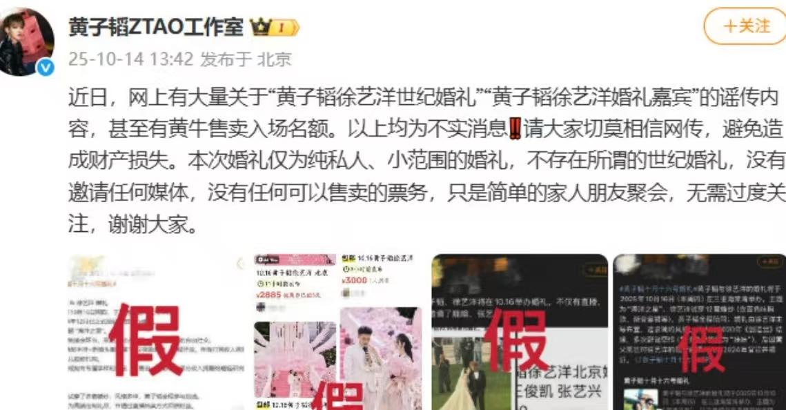 这反转也太刺激了!10月14号刚说要辟谣,黄子韬徐艺洋的婚礼瓜就又变样了,前几天还传要直播婚礼,黄牛都敢喊4500元包进场,结果工作室立马出来说根本没这回事,就是小范围请亲友,不请媒体更不卖票! 可这边刚澄清,那边徐艺洋晒的12套婚纱图就刷屏了,网友看了都直呼“心跳加速”,10月16号的婚礼热度半点没降。 一边说要搞低调私人局,一边婚纱照又赚足眼球,这场婚礼到底是真・内娱清流,还是换了种方式炒作啊? 刚刷到个大消息,黄子韬和徐艺洋要办婚礼了!就在10月16号左右,这消息一出来,好多人都等着看热闹。 据说俩人这次婚礼特别不一样,压根没设伴郎伴娘,就想搞成纯亲友派对,只请家里人和关系近的艺人。 徐艺洋前几天晒出试穿12套婚纱的图片,网友看得直夸“好看”,连看到鱼尾裙都直言“心跳加速”。 更让人稀罕的是,早前还有消息说他俩要直播婚礼,跟粉丝一起分享喜悦,不少人说这是明星婚礼和粉丝互动的新花样。可没想到,这边消息刚传,黄牛就冒出来了,喊着“4500元包进现场”,简直离谱。 10月14号当天,黄子韬工作室就火速出来打假了,压根没有“世纪婚礼”这一说,婚礼就是小圈子的私人聚会,媒体没请,更不存在卖票的事儿,特意提醒大家别被骗。这波反转来得又快又干脆,反倒把婚礼话题给推上了热搜。 说起他俩的感情,那可是足足十年的缘分,跟偶像剧似的。2014年在SM练习室就认识了。 真正走到一起是2020年,黄子韬当《创造营2020》导师,徐艺洋是他公司的艺人参赛。那时候黄子韬在台上对她挺严格,私下里却偷偷递纸巾,细节里全是温柔。 两人被媒体发现恋情时,还多次否认,后被实锤,被网友调侃“史诗级打脸”,徐艺洋回应“选择按照自身的节奏公开,并非故意隐瞒”。2024年求婚成功,7月官宣恋情,12月就晒了结婚证,黄子韬说“目标已达成”,甜度爆表。 不光如此,他之前还跨界创立了卫生巾品牌名叫“朵薇”,主打平价好用,还以“透明工厂”“徐艺洋亲测”“家人自用”回应信任危机。品牌联合公益博主向贵州山区捐物资,这份细腻和同理心,让粉丝更觉得他靠谱。 也正因如此,大家才夸他的婚礼是“内娱清流”,不搞铺张浪费,还总想着把善意传递出去。不过也有人觉得,又是直播传闻又是炒作,难免有点太商业化。 其实细想,他俩的感情一直挺纯粹的。徐艺洋说遇到黄子韬前从没想过30岁前结婚,是他给了足够的安全感;黄子韬也说徐艺洋最吸引他的是“人生像张干净的白纸”。从练习室的初遇到现在的婚礼,这么多年的时间,黄子韬的真诚从来没变过,俩人一路从绯闻到官宣,再到组建家庭,这份感情里藏着的真心,也从没变过。 现在就等着看看这场充满争议又满是浪漫的婚礼到底啥样。 不管有没有直播,能看到这对长情的恋人终成眷属,也是件挺让人开心的事。毕竟在娱乐圈里,能从一而终的感情,能始终保持初心做实事的人,从来都值得祝福。