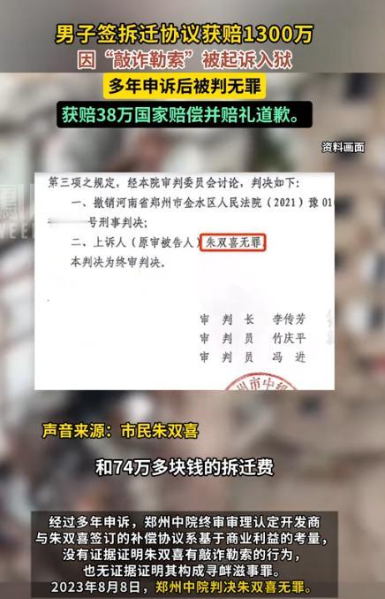 10月13日报道,河南郑州,一男子花大钱,盖了2栋共计1500平的楼,几年后赶上了拆迁,开发商只同意补偿他200平的安置房和74万元,男子觉得亏大了不同意,开发商答应补偿男子1300多万后,他才搬走,可万万没想到,2年后,开发商竟突然把男子告上法庭,说他敲诈勒索,男子被羁押了541天,这期间3个亲人去世,还错过了评高级职称,案子经过3审,他终于等到昭雪这一天男子愤怒的索赔260万国家赔偿,法院的判决让他咽不下这口气。 2000年起,朱双喜在郑州金水区辛辛苦苦盖起了两栋楼,总面积1500多平方米。 这些房子是他几十年攒下的钱、汗水堆起来的。 他原本想着留一栋自住,一栋出租,老两口能靠房租安稳过下半辈子。 可2012年,城中村改造开始,开发商找到他,说要拆迁。 补偿方案出来那天,他整个人都愣了:只有200平毛坯安置房外加74万元。 朱双喜当场就说:“我这房光盖就花了三百万,你们这点补偿,不够我本钱。” 从那以后,他天天往街道办、开发商那边跑,一谈就是五年,吵过、哭过、写信反映过,但事情一直没个结果。 到了2017年7月,事情突然有了变化。 那天,开发商带着几名工作人员上门,说愿意重新谈,并现场签了补充协议,还出具了承诺书,“协议自愿签订,一切责任由公司承担”,红章盖得清清楚楚。 朱双喜一看,这次似乎终于有诚意。 两天后,1300多万元的补偿款分两次打进了他的账户。 他第一时间还清贷款,处理债务,还特意请了几位邻居吃饭庆祝,心想这么多年总算熬出头了。 可没想到,好日子刚过两年,噩梦就来了。 2019年8月,他正和老伴在鸡公山旅游,突然被几名民警当场带走。 理由是开发商报警称,他“以威胁手段逼迫公司签约”。 朱双喜当场懵了:“我有签约录像,还有带章的承诺书,咋就成威胁了?” 可接下来的两年,他的日子全变了样。 2021年7月,法院一审判他“寻衅滋事罪”成立,判四年徒刑,还要追缴1300万元“赃款”。 他当场上诉,虽然后来取保候审,但从看守所出来时,头发已经白了大半,整个人瘦了一圈。 医生说他血压三期,得长期吃药。 更难的是,噩耗接二连三传来。 82岁的老母亲因为牵挂儿子,整夜睡不着觉,最后突发脑溢血去世。 岳母的肺癌恶化,也没能熬过那年冬天。 后来,姐姐又出车祸,当场身亡。 三位亲人接连离世,朱双喜在看守所里听到消息,整整一夜没说一句话,只是靠在墙边哭。 事业也毁了,他原本是省直事业单位职工,当年正准备申报高级职称,结果被抓后直接被取消资格。 事情直到2023年才迎来转机。几家媒体报道后,案子终于被重新审查。 8月8日,法院终审宣判:没有证据证明朱双喜有敲诈勒索行为,协议属开发商自愿签订,判决,无罪。 听到“无罪”两个字,朱双喜当庭泪流满面。 他被羁押了541天,这541天里,家散了、人瘦了、头白了。 2025年7月,他向法院申请国家赔偿,总共索赔260万元,包括人身自由被剥夺的损失、错过职称的待遇,还有100万元精神赔偿金。他说:“我不要天价赔偿,只希望国家能给个公道。” 可10月下来的结果让他彻底心凉:法院只判赔38万多,其中人身自由赔偿25万,精神损害12万,其余一概驳回。 拿到判决书那天,他的手一直在抖。 那张盖着红章的承诺书,他现在仍随身放在公文包里。 纸没褶,章还红,但生活早已变了样。 亲人走了,身体垮了,人生最好的几年被白白耗掉。 如今的朱双喜,还在坚持追责。 一场从拆迁开始的纠纷,最终演成了一个家庭的灾难。 虽然法院最后判了无罪,可那541天的牢狱、三位亲人的离世,谁来还? 朱双喜说:“我不是为了钱,我就想要个明明白白的公道。” 在他眼里,那38万元的赔偿,买不回时间,更换不回命。 那张红章承诺书,不仅见证了他从希望到绝望的全部人生,也是一位普通人被体制碾过后的无声控诉。 对此你怎么看? 信源:凤凰WEEKLY