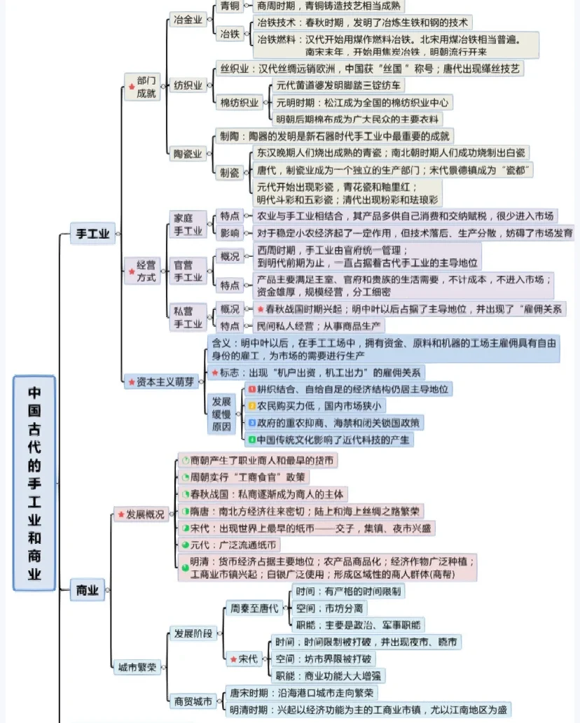 中国农业经济的基本特点1.从生产组织形式看 ,一家一户的小农经济(自然经济)是中国古代封建社会形态的基础,也是古代中国农业经济的基本特点.2.从土地制度看, 以地主土地所有制为基础的土地制度3.从农业生产结构(经济构成)看, 以种植业为主,家畜饲养业为辅是古代中国农业经济的基本特点.4.从农耕技术的发展(农业生产模式或生产力)看, 借用牛力耕田,不断改良生产工具,生产技术使精耕细作的农业生产模式日益完善,也是古代中国农业经济的基本特点.(比较成熟的农业技术和相对完备的农业管理是中国古代经济突出的特征之一.)5.历代统治者都制定土地制度和赋税制度,并通过调整使生产关系得到改善,为农业经济发展创造条件.古代手工业发展的特征1.历史悠久,素称发达,产品不仅在国内销售,而且行销亚、非、欧,受到广泛赞誉.2.官营手工业、私营手工业、家庭手工业三种经营形态并存.3.部门不断增加,分工越来越细.4.手工业生产技术不断进步、手工业生产规模不断扩大.5.经济重心南移与手工业生产布局成相应变化.6.手工业发展与农业紧密结合,并且受到农业的制约.7.官营手工业长期处于支配地位.8.统治者在政策上的一贯影响,导致手工业发展具有落后性,规模有限.中国古代商业特点1.商业起源早,并且在不断的发展.2.与农业、手工业的发展紧密相联,相辅相成3.阶段性特征明显,各个时期发展极不平衡4.商业发展始终处于封建政府的压抑和控制之下.5.市场交换不能动摇封建经济制度,为资本主义发展创造条件.6.城市商品经济逐渐发展,明清到达高峰.7.对外贸易兴盛,明中期后衰落.
