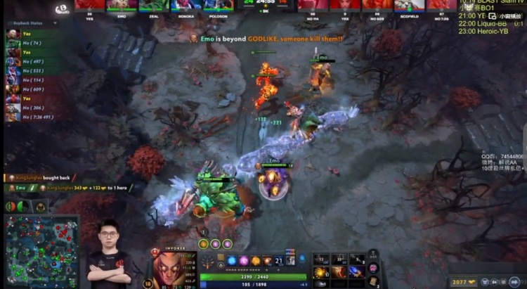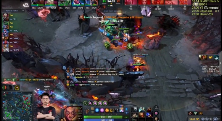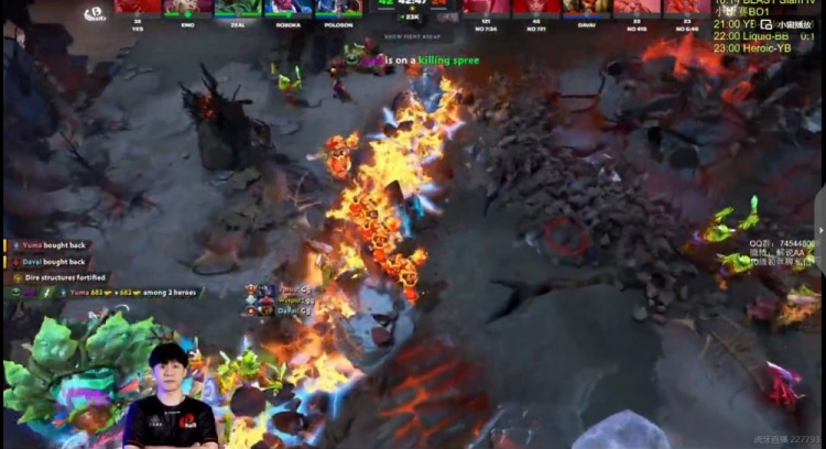 [34分钟]YB开雾找到机会,卡尔留住Scofield海民,随后zeal潮汐跳大击飞四个,配合上了flyfly拍拍晕锤进场,还有Emo卡尔大天火瞬间秒掉了女王+海民+Yuma的TA!YB追击上高地完成对Heroic的团灭!Emo卡尔三杀!随后拆掉中下两路高地!拉开24K经济差了!