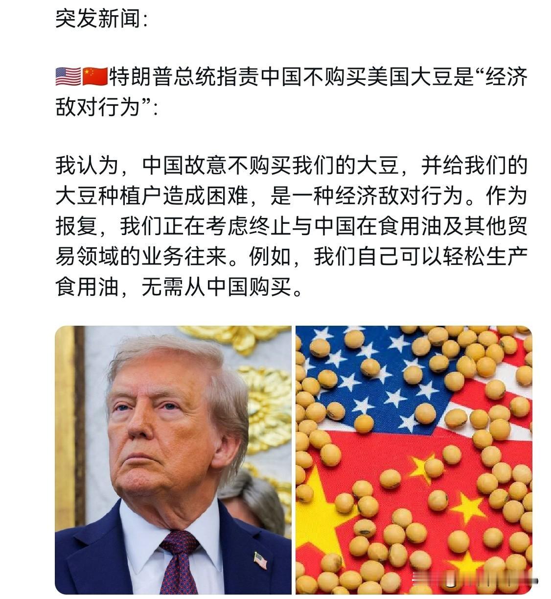特朗普撂话,中国再不购买,美国将会报复!10月14日,特朗普放话声称,我认为中国故意不购买我们的大豆,给我们的大豆农民带来困难,这是一种经济敌对行为。我们正在考虑终止与中国的食用油业务,以及其他贸易项目,作为报复。例如,我们可以很容易地自己生产食用油,我们不需要从中国购买。 很显然,看见我们不购买美国的大豆,特朗普再次撂话以威胁的口吻要对我们反制了。面对这样的警告,我们还是劝美国收起这种口水。事实上,现在美国国内越来越意识到就是因为特朗普本人发动贸易战,才导致美国种植户失去了订单,他们正越来越把矛头指向特朗普本人。 现在特朗普对我们威胁警告,本质上就是转移美国国内的注意力,把我们当替罪羊,但这种伎俩不会改变美国大豆滞销的现实。至于特朗普的威胁警告,对我们是一点用都没有。特朗普语气越强烈,这说明其越焦虑。没有美国的大豆,对于我们不是一个大问题。特朗普如果愿意,倒是可以动员美国人把大豆压榨成大豆油,这样美国大豆的滞销问题,说不定就解决了!