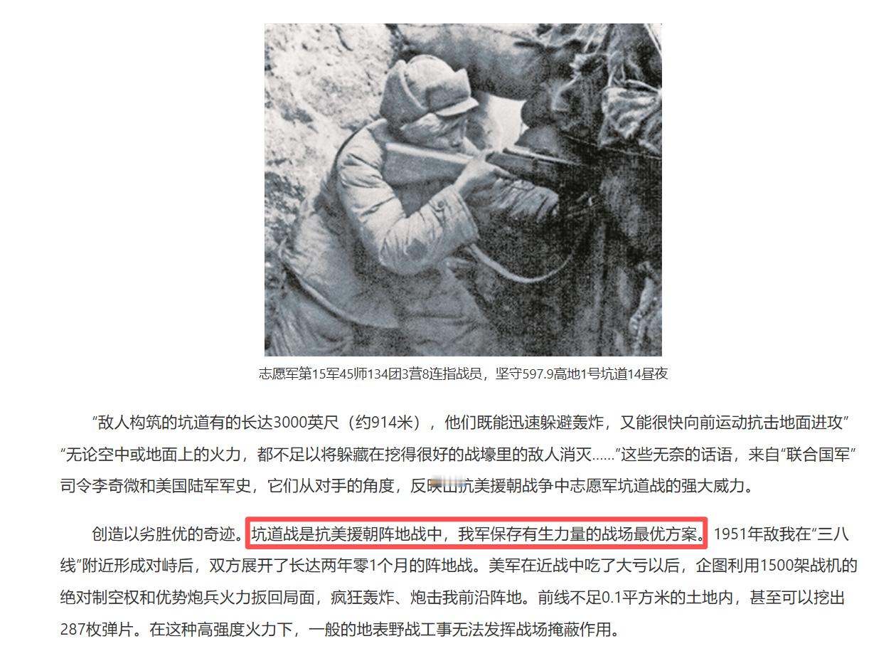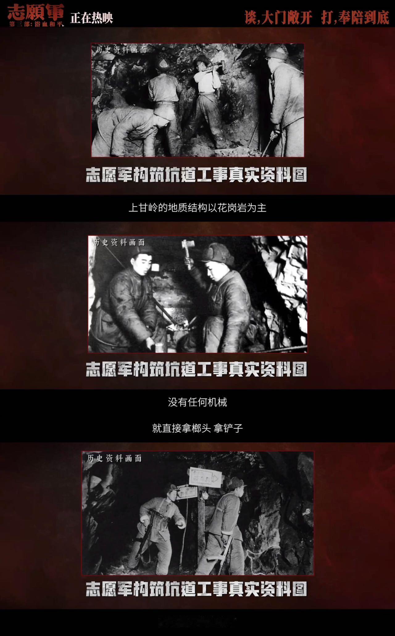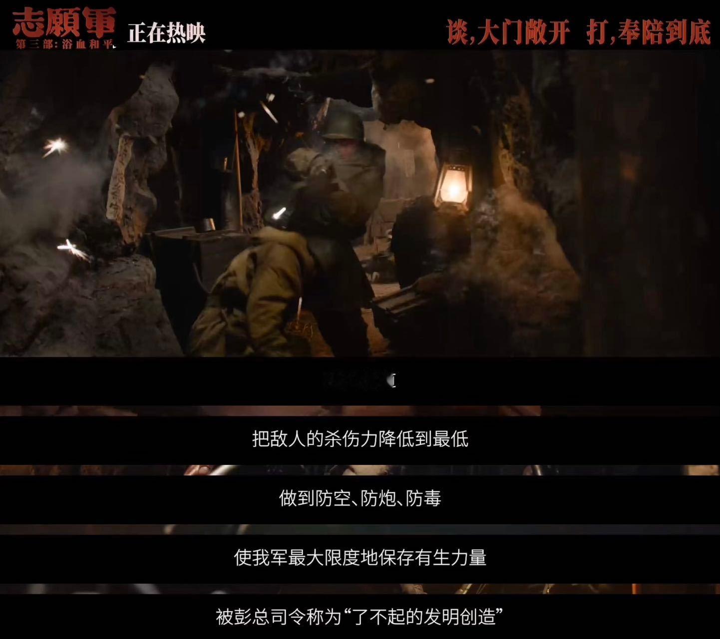 上甘岭坑道战凸显志愿军作战智慧志愿军一锹一铲凿出地下长城 看完《志愿军:浴血和平》今天发布的坑道战特辑后,才真正知道我们志愿军战士当年是在多艰苦的环境下战胜敌人的!在敌人占据绝对火力优势的情况下,志愿军凭借坑道有效保存了有生力量。即便表面阵地失守,部队依然能进入坑道躲避猛烈的空袭与炮击,并做好部署,在夜间发起绝地反击,重新夺回表面阵地!这套用一锹一铲创造出的“地下长城”长达1250公里,能够防空、防炮、防/毒(疫)、防雨、防潮、防火和防寒,被彭总/司/令誉为“了不起的发明创造”,将志愿军的智慧与意志发挥到了极致,越看越让人热血沸腾,向每一位志愿军战士致敬,电影院二刷走起!