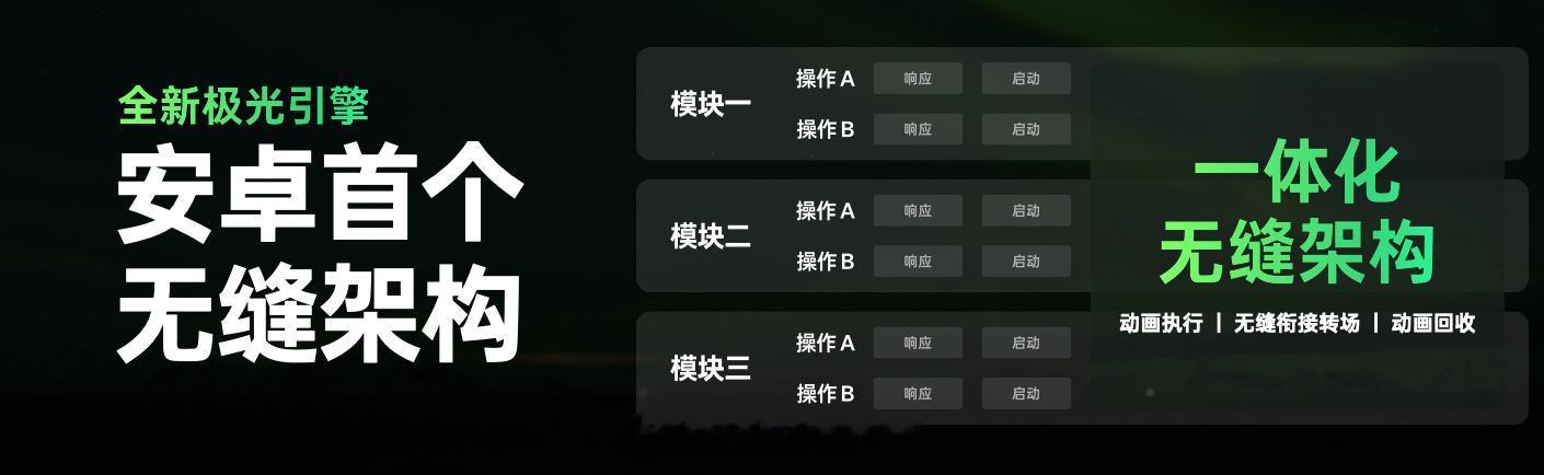 全新极光引擎带来安卓首个无缝架构,通过重塑传统安卓模块化架构,将不同业务模块进行一体化无缝绘制和分布式响应调度,实现「从哪里来,回哪里去」的模式