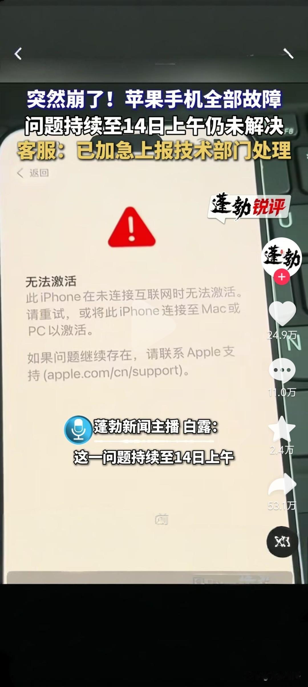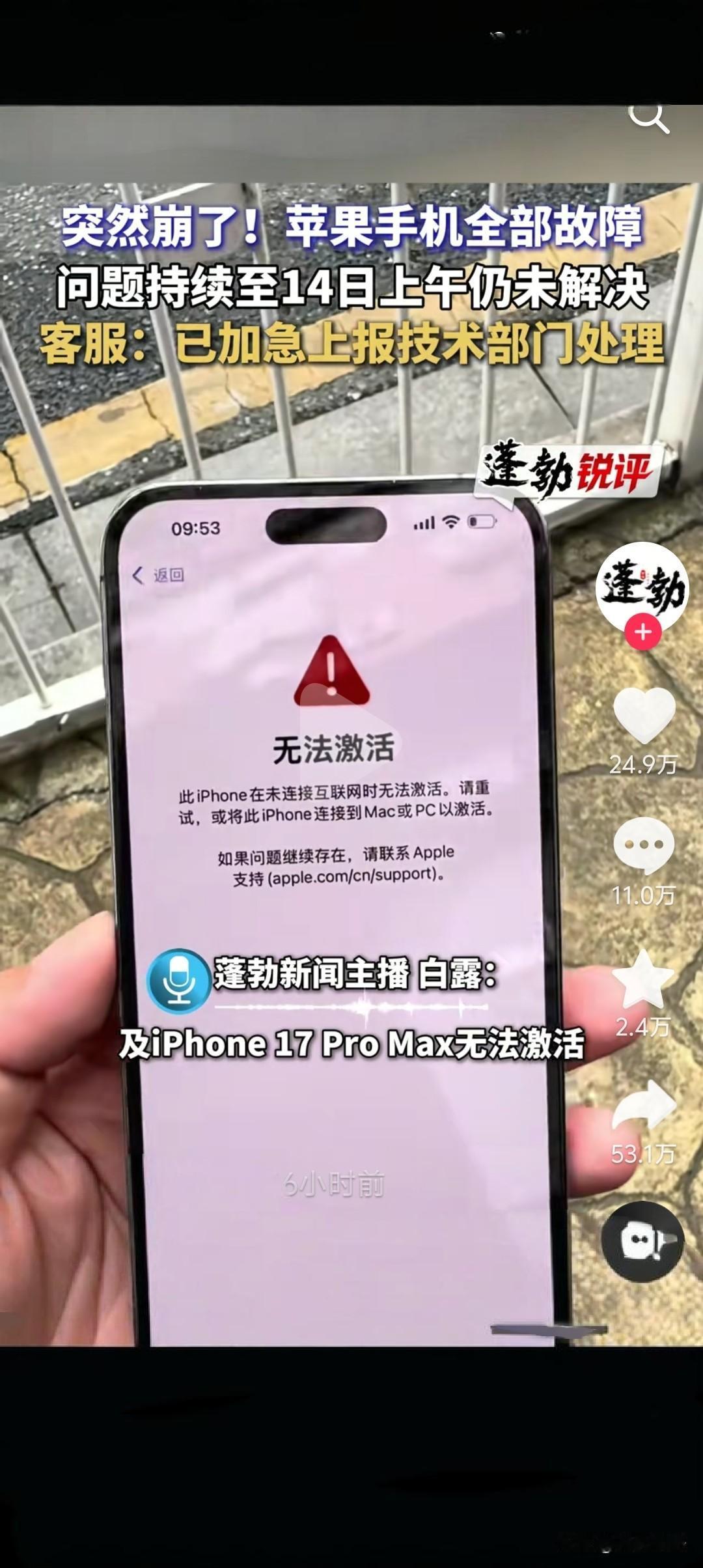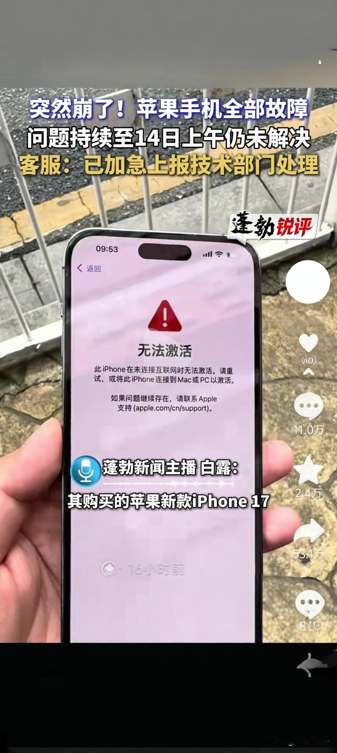 买苹果手机的人“炸了”?买来激活不了了。现在支付不了 ,聊天不了,只能当板砖了。 2025年10月14号早上开始,有很多人买了iPhone,结果到官方的账号下评论,反馈锁屏时间不更新、系统卡顿、网络异常、部分的功能基本上失灵了。 iPhone 15 Pro Max、iPhone 16 Pro、iPhone 17这些型号基本上都用不了了。 现在抖音、微博、小红书上到处都在说苹果系统崩了,用不了了。 甚至现在有很多的人买了17的,现在直接激活不了了,都只能当板砖用了。