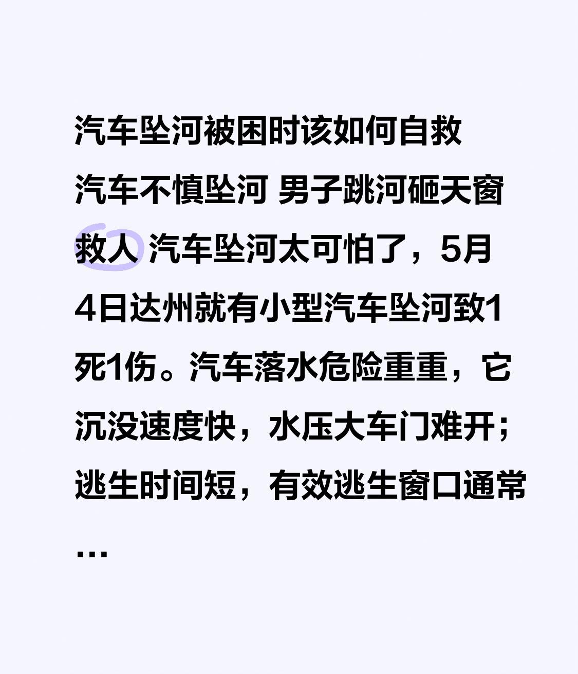 汽车坠河被困时该如何自救 汽车不慎坠河 男子跳河砸天窗救人 汽车坠河太可怕了,5月4日达州就有小型汽车坠河致1死1伤。汽车落水危险重重,它沉没速度快,水压大车门难开;逃生时间短,有效逃生窗口通常不超3分钟;坠落冲击强,可能导致人员昏迷骨折;救援难度大,水下情况复杂。 不过10月14日泰州有暖心一幕,一辆汽车坠河,退伍军人和民警出手,前者携石块跳河砸窗,与其他市民合力救出被困人员,两人手都受伤了,值得点赞。 遇到汽车坠河,一定要头脑清醒积极自救,刚落水时保持冷静,别躲在车内干等,抓住黄金3分钟很关键。