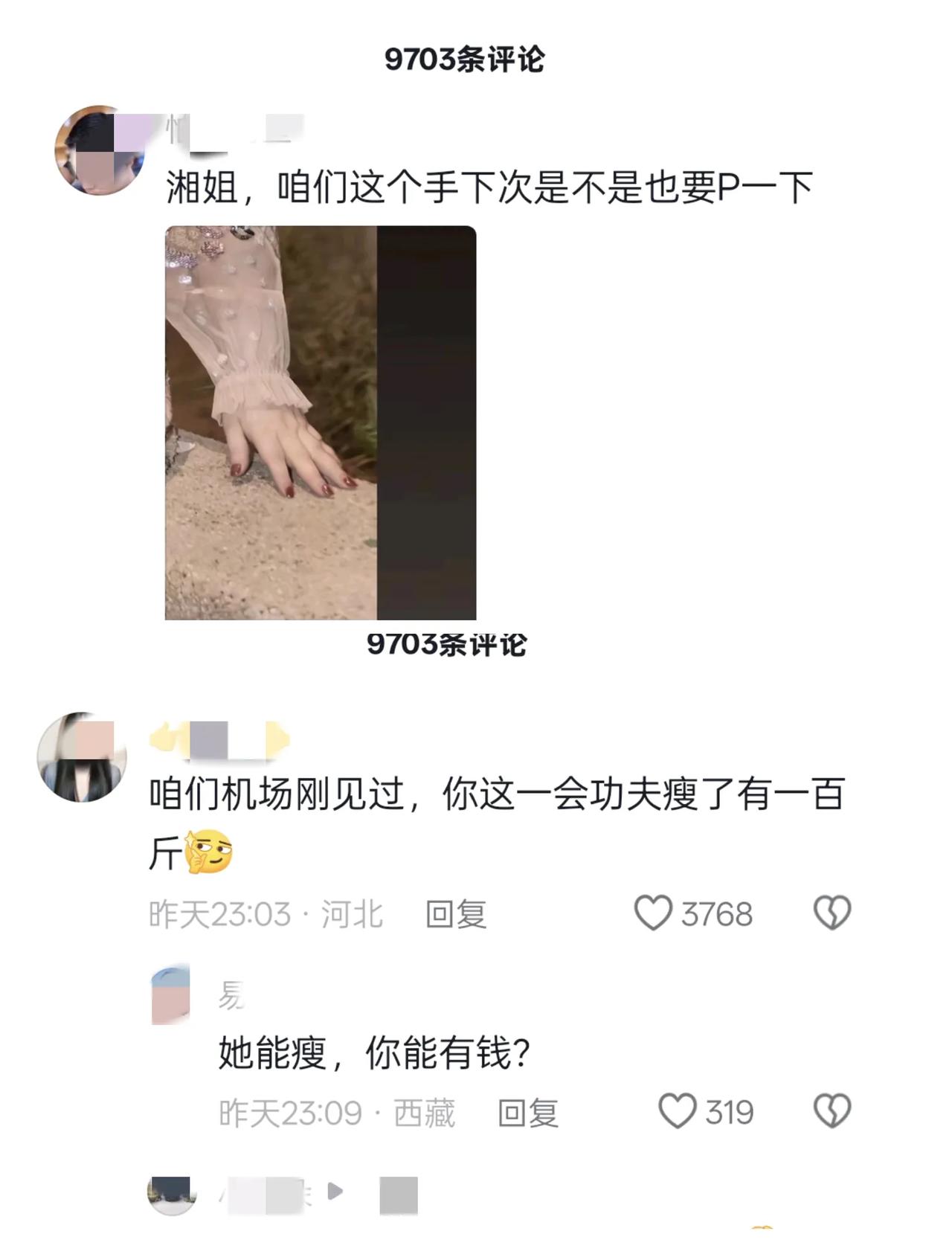 刚又刷到湘姐的抖音,晒了好几张美照,一打开评论区,天塌了……网友们也太勇敢了,直接晒湘姐在机场的真实照片,说机场咱们刚见过,一会儿功夫瘦了一百斤。[捂脸]别这样说,不太礼貌吧。还有网友细看照片,说发现手好像没P? 哎,照我说,爱美是每个女孩子的权利,不要在意这些细节哈。照片无论是不是P的,都无伤大雅,自己开心就好,您说是吗?