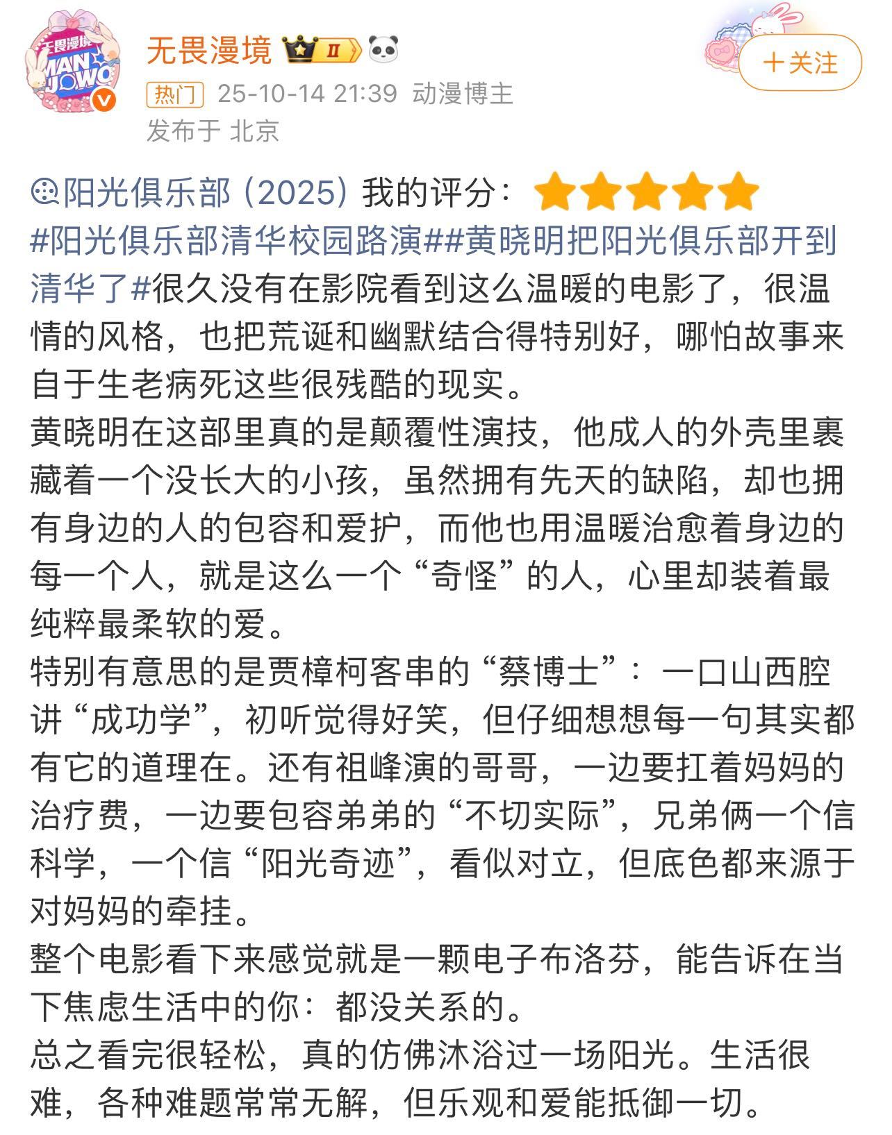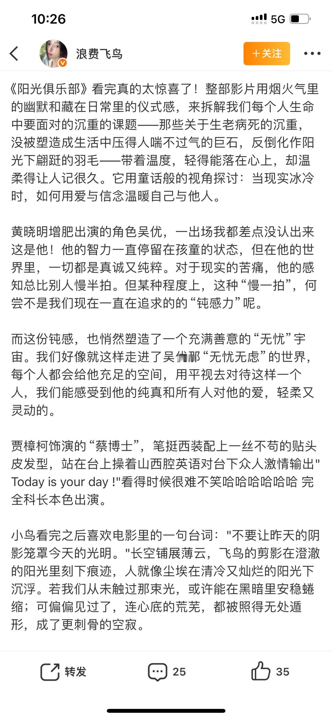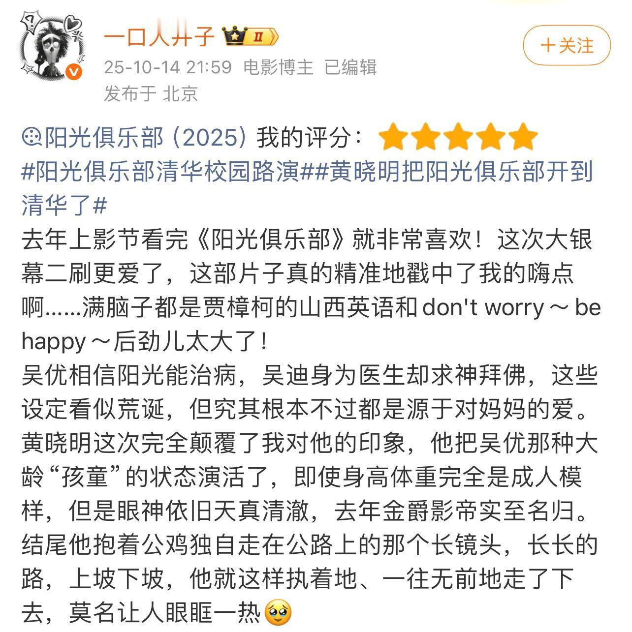 刷到黄晓明《阳光俱乐部》的口碑反馈还挺直观,不少观众说看完片子,居然没立刻认出是黄晓明。大家对他这次的角色塑造评价很实在,和之前的形象完全颠覆了,10月25号去影院支持一波! ​​​