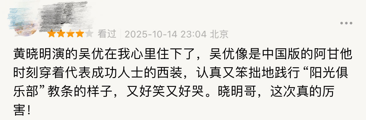 刷到黄晓明《阳光俱乐部》的口碑反馈还挺直观,不少观众说看完片子,居然没立刻认出是