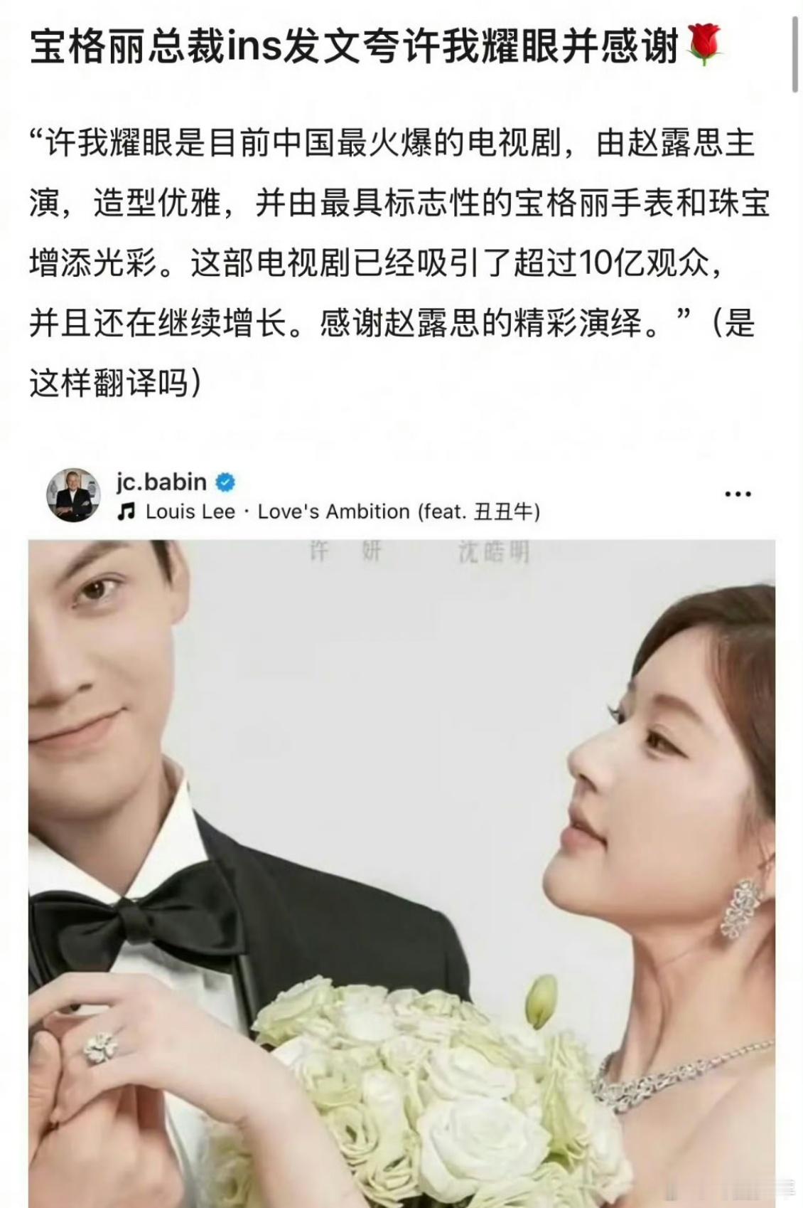 宝格丽总裁发帖感谢许我耀眼 宝格丽总裁亲自发ins感谢,这波国际认可含金量拉满!《许我耀眼》的品质与赵露思的魅力强强联合,不仅征服国内观众,更得到品牌高层青睐,这份排面与实力,简直太绝!