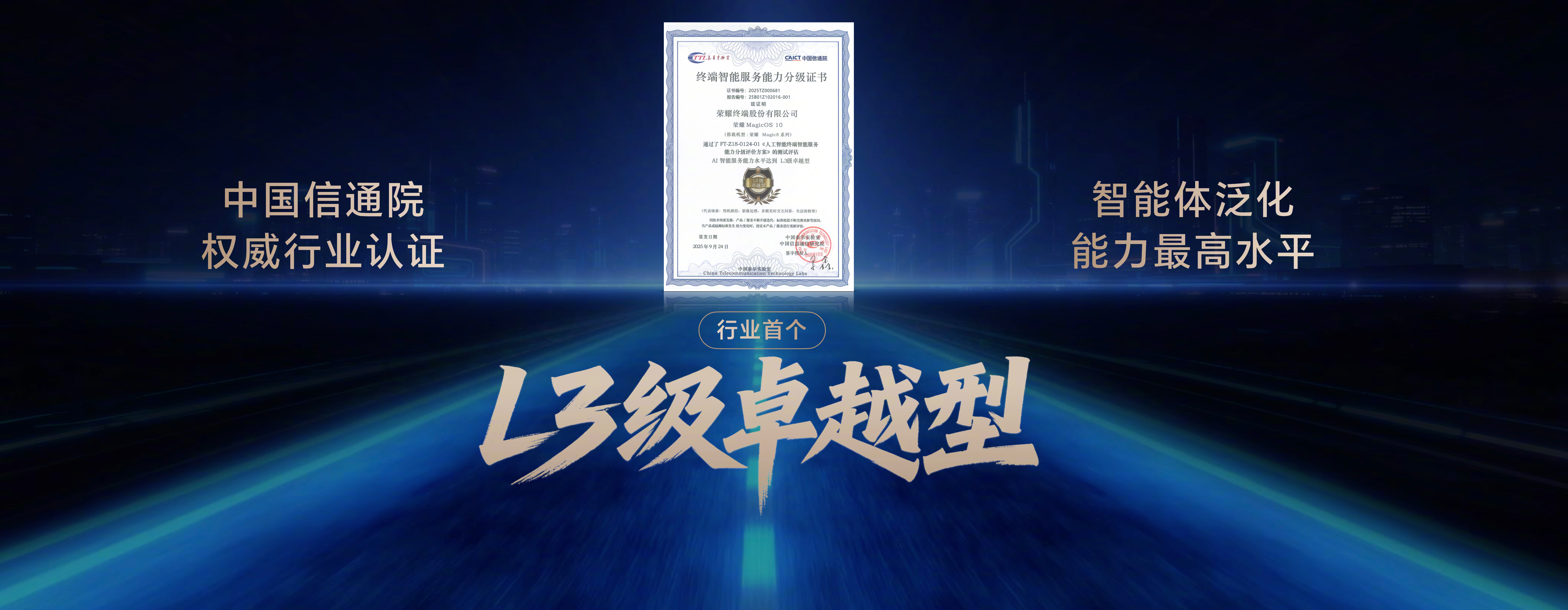 荣耀Magic8每天都在自进化荣耀Magic8AI手机的含金量,看认证更看进化力!荣耀Magic8凭借硬实力通过中国信通院L3卓越级权威认证,树立行业新标杆。这一认证代表当前智能体泛化能力的最高水平,意味着YOYO能灵活应对各类复杂场景,而非局限于固定指令。同时,YOYO深度融合个人知识库跨端记忆与多模态 Agent协同执行能力,基于行业最强MagicGUI多模态大模型,具备场景自进化与任务泛化能力,真正实现从传统智能助手到个人智慧代理的跨越,既能精准理解用户需求,又能记住用户偏好,还能主动规划任务、精准执行操作,为用户带来更智能的使用体验。荣耀发布会