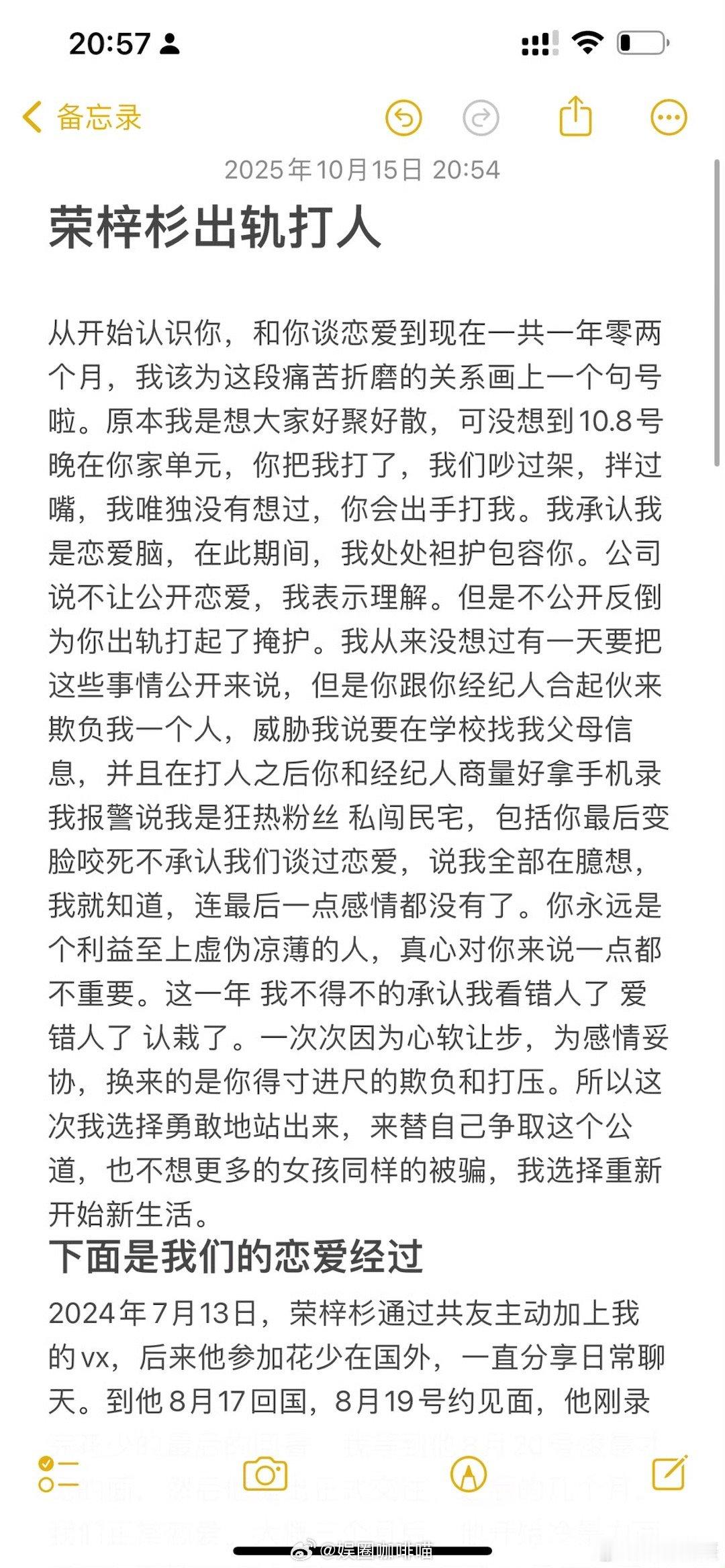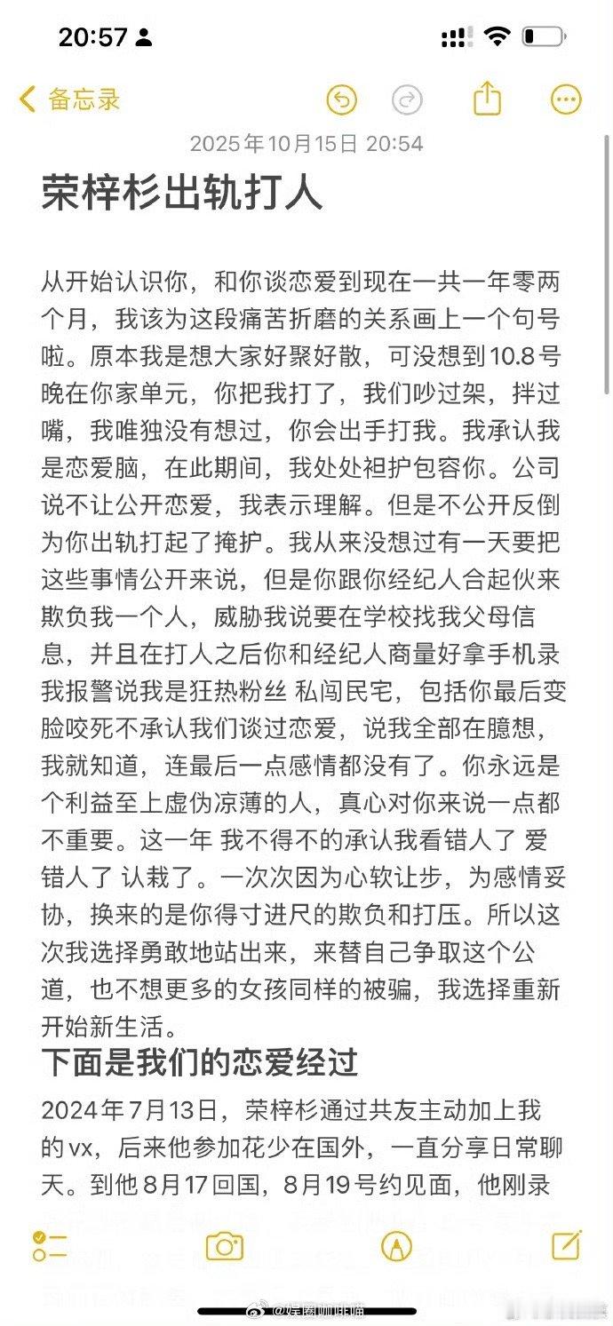 李禹熹称荣梓杉出轨打人李禹熹发文喊话荣梓杉曝荣梓杉恋爱期间出轨打人 李禹熹喊话荣梓杉!从朱朝阳到人设崩塌?这瓜太窒息。刚刷到中戏女生李禹熹的发文,真的看得拳头都硬了…李禹熹称荣梓杉出轨打人 这词条直接炸上热搜,细节比电视剧还抓马。李禹熹发文曝恋爱三个月后开始冷暴力,恋爱存续期暧昧多名女生。她因为荣梓杉冷暴力一度确诊中度焦虑和抑郁,喊话他道歉,还晒出了报案回执和医院诊断证明。 李禹熹称荣梓杉出轨打人 ​​​