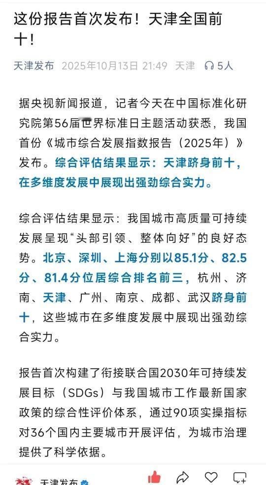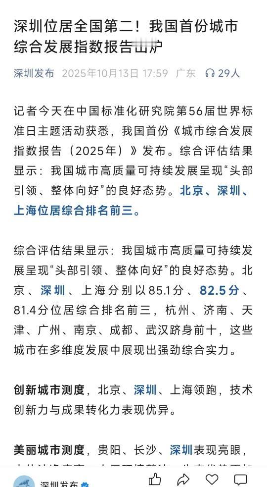 我国首份城市综合发展指数济南跻身全国前十 [一]央视新闻在中国标准化研究院第56届世界标准日主题活动获悉,我国首份《城市综合发展指数报告(2025年)》发布。综合评估结果显示:我国城市高质量可持续发展呈现“头部引领、整体向好”的良好态势。北京、深圳、上海位居综合排名前三。 [二]综合评估结果显示:我国城市高质量可持续发展呈现“头部引领、整体向好”的良好态势。北京、深圳、上海分别以85.1分、82.5分、81.4分位居综合排名前三,杭州、济南、天津、广州、南京、成都、武汉跻身前十,这些城市在多维度发展中展现出强劲综合实力。 山东 济南 济南攻略 济南找工作 济南买房 济南旅游 济南打卡 济南旅行 济南同城