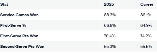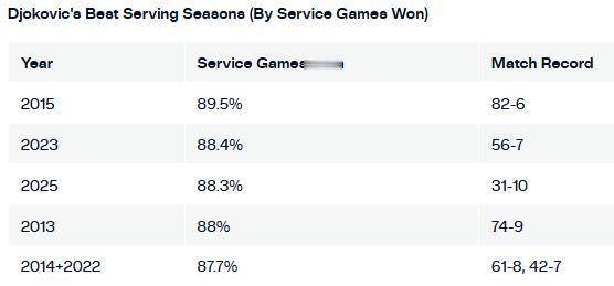 真正的六边形战士!德约科维奇的接发依然非常强势,但如今真正让他突出的是——他的发球。 截止到上海大师赛时,德约科维奇在2025赛季赢得了88.3%的发球局,排名第四,仅落后于辛纳、弗里茨、奥佩尔卡(88.7%)。 这位40次ATP大师1000赛冠军的职业生涯中,平均每场比赛发球ACE数为5.5个。而本赛季,他的场均ACE数达到了8.4个。