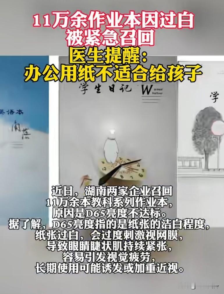 11万本作业本因过白被紧急召回,医生提醒,办公用纸不适合孩子,会过度刺激视网膜 80后,用的防近视纸张,小时候考试的试卷还是老师自己排版印刷的呢,都是哑光米色的,现在的纸质书也都是这种纸。以前本子防近视淡黄色觉得好,阔以借鉴一哈,刚好吃了细糠,少看点手机比啥都强,故意的吧,避重就轻