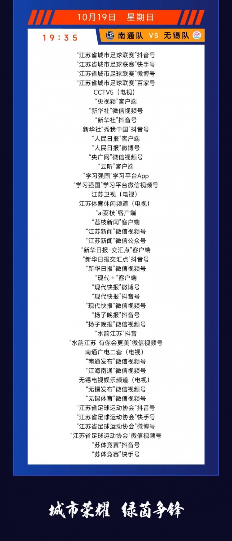 赛前苏超官方公布了这两场比赛的直播计划,包括CCTV、央视频、新华社、人民日报、央广网在内的知名平台都将直播本场比赛!