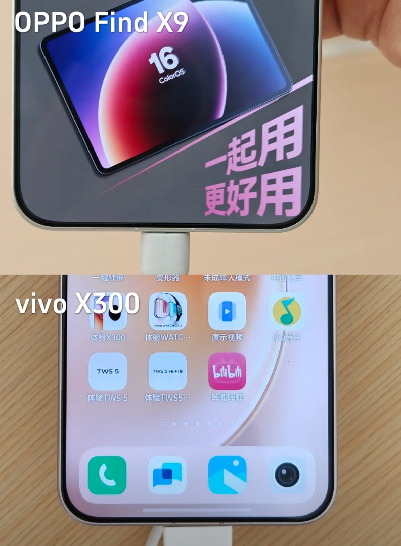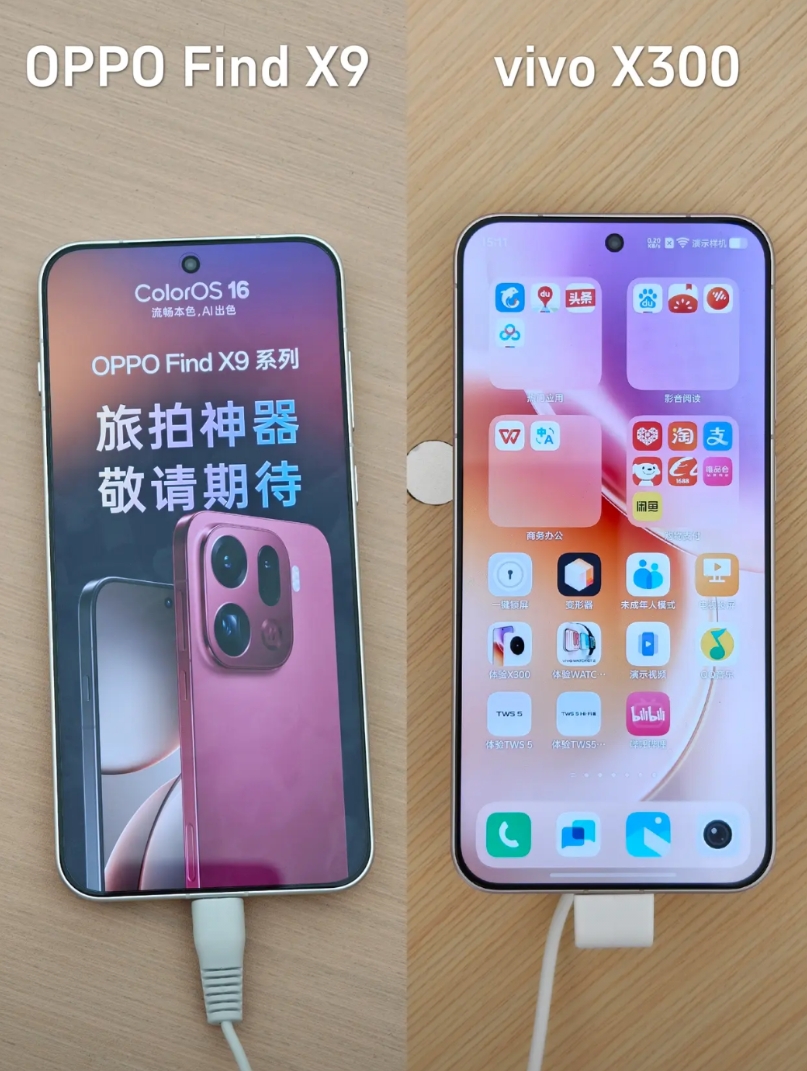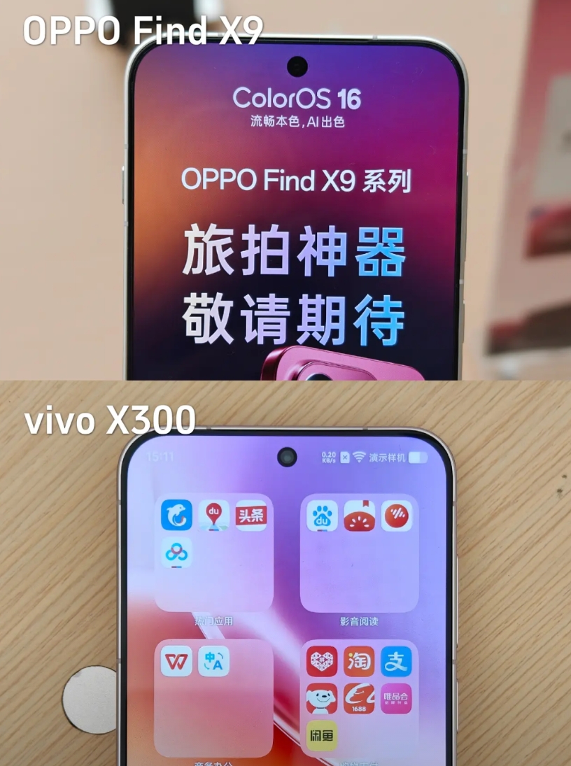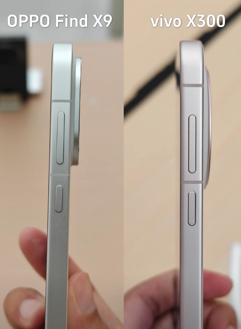 X300是大圆环镜头模组,看着对称一点但确实有些审美疲劳了;Find X9则是左上角矩形,握着手指不会碰到镜头模组更舒服点。正面屏幕黑边都很窄,比苹果还窄,观感上个人一眼觉得O的黑边比V的窄一丢丢,难道是错觉?