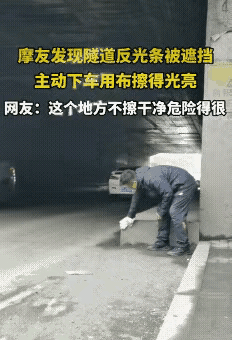 太暖了!一位摩友,在隧道里停下来,拿着块布仔仔细细擦着反光条。那些条子被灰尘盖得