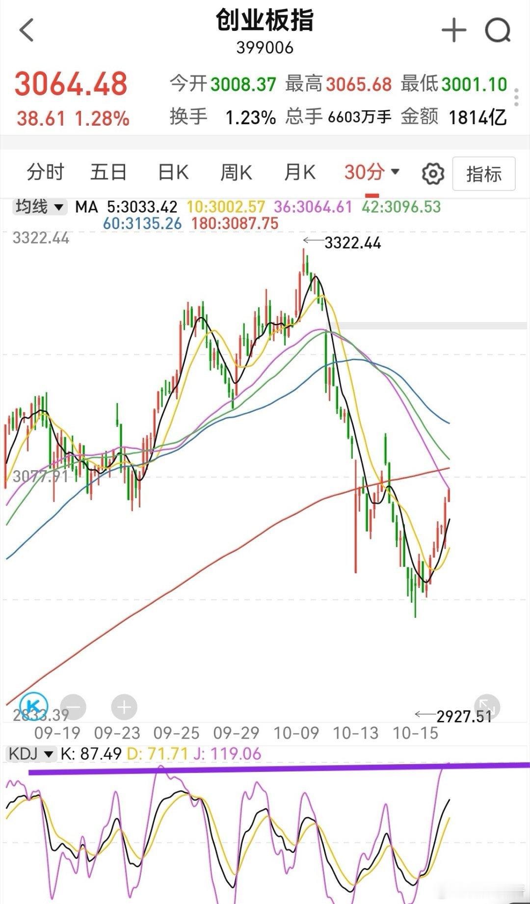 大伙早!创业板昨天反弹大涨,半小时kdj相对高位,需要修复一下。早上指数大涨的概