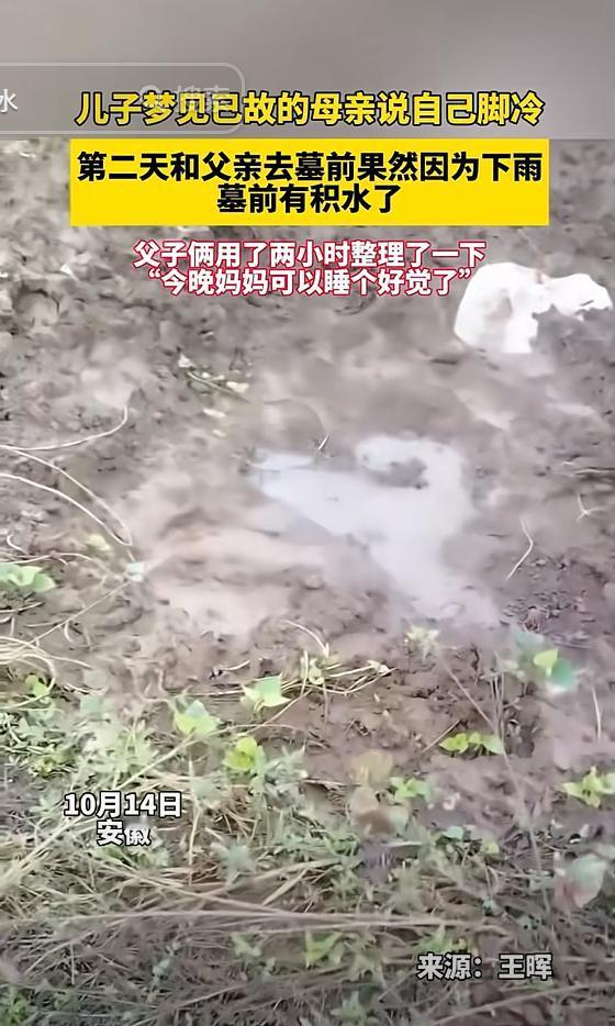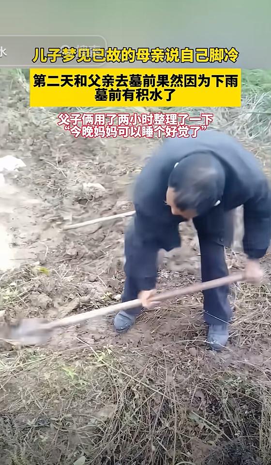 “看哭了!”安徽六安,儿子睡前想起母亲生前格外怕冷的老毛病,夜里竟梦到了她,梦里妈妈对他说自己脚冷,就这两个字,让儿子醒来后放心不下,一大早就告诉了爸爸,父子俩去了坟地,雨后积起的凉水正浸着坟脚,儿子泪流满面! 谁没梦到过已故的亲人?大多醒了叹口气,翻个身就忘了。 10月15日,安徽六安这儿子不一样,梦里妈就说俩字“脚冷”,他愣是睁着眼到天亮,拽着老爹就往坟地冲。 这一去,还真撞见了让人心头发紧的事儿。 母亲墓地旁边的排水沟堵住了,昨晚上又下了雨,坟脚前正好有一滩凉水,看着就透心凉。 还好父亲的车上有个铲子,儿子没带铲子,就折了几根粗树枝,两人就这么蹲下来干。 爸爸用铲子刨泥,指甲缝里全是黑泥,蹭得满手都是,儿子也没闲着,上手拽杂草,草汁把掌心染成绿色,溅到裤脚也没顾上擦。 俩小时没歇气,父子俩忙活了半天,终于看着沟里的水慢慢流走,旁边的积水也见了底,父子俩才找块石头擦了擦手,放下心来。 要说为什么这么巧,一有积水,儿子就能知道母亲“冷”? 其实这是父子俩对她的牵挂,在秋天雨夜的时候,想到了母亲。 母亲去世后,儿子总是牵挂着母亲,再加上天气转凉,儿子感觉到冷,就想起了母亲生前的事。 原来她一直是怕冷的,儿子小的时候,就会给她暖脚,大点了会给她买暖脚壶,这么多年了,他一直都没忘。 当初选坟地时,爸爸还特意让人挖了排水沟,这份心思也没随着时间淡了。 这哪是什么巧合?不过是俩人事事都想着她,连梦里的一句话、身上的一阵凉,都能揪着心。 清理完之后,父子俩还对着坟头絮叨家常,还说了自己的近况,让母亲放下心,父子俩都在努力且认真的生活着,一切都跟她还在的时候一样。 感觉母亲不会再担心了,父子俩才一步三回头的离开。 原来孝心不用多隆重,就是把那些没说出口的惦记,变成实实在在的小事,就已经足够了。 你想啊,要是这儿子不重视母亲的话,醒了就当梦一场,要是爸爸觉得他瞎折腾,那坟脚的积水还得泡着,妈生前怕脚冷的习惯,也就没人再记着了。 儿子也提醒大家,到了秋冬季节,雨水也多了,祭扫的时候,留意墓区排水系统,维护逝者安息环境。 看到附近有杂草,也要及时休整一下,防止排水不通,免得有太多积水。 这父子俩没做啥惊天动地的大事,可就是这份“把梦当真”的较真,让他们遇到了这件让人难以忘怀的事。 这也提醒我们,要趁着父母都还健在的时候,多多陪陪他们,听他们唠叨几句,这比什么都珍贵。 平凡日子里的孝心,最能打动人,我们要把爱藏在每个日常里,让父母知道我们的惦记,让他们能开开心心的生活。 千万别等他们都老了,失去他们的时候,才想着回忆,要在有限的时间里,给他们更多的爱,这样的人生才不会留遗憾。 对于这件事,你怎么看? (来源:经广之声 2025年10月15日 儿子梦见已故的母亲说脚冷,第二天和父亲去墓前看发现有积水)