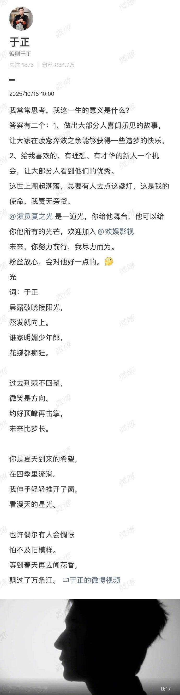 于正发文庆祝夏之光签约欢娱谁还没刷到?夏之光签约欢娱,于正还发了文,之前他的角色都很圈粉,新征程冲!于正官宣夏之光签约欢娱影视于正宣布的大事是夏之光签约欢娱