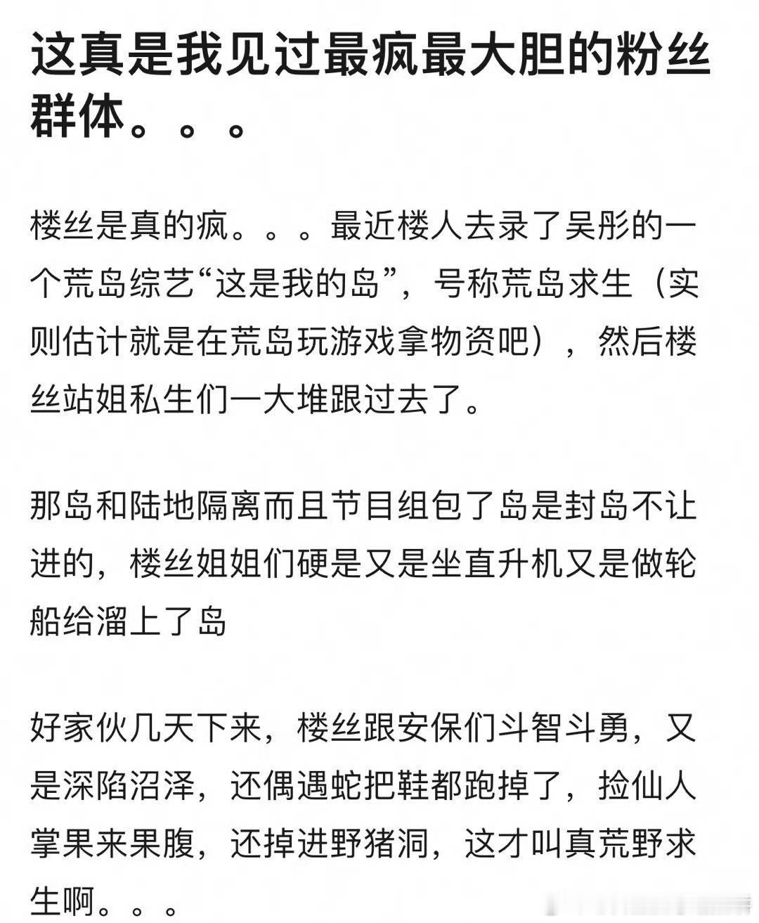 楼丝无处不在:荣梓杉被女演员控诉和别人去北电看毕业大戏,楼丝拍到了现场照;时团去非洲坦桑尼亚录团综,去非洲的楼丝比动物都多;去荒岛上拍综艺,楼丝翻沼泽地翻仙人掌地爬栅栏;黄子韬徐艺洋官宣,转发楼丝玩梗;黄晓明之前官宣,转发还是楼丝玩梗;晚会主持人特写镜头,旁边楼丝见缝插针安利;连四代的杨博文在天上滑滑翔伞,楼丝都能出同高度的第一视角;steam小游戏线索是炸人出道日,嫌疑人名字是楼丝花名;为了找自担,能从冬奥户闭幕式台上几千人的找出来自家的镜头