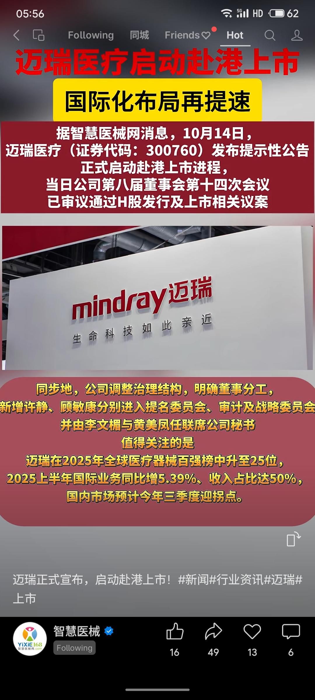 10月14日,迈瑞医疗宣布正式启动赴港上市进程,拟发行不超过总股本10%的H股。募集资金将主要用于加速国际化布局、加强研发投入及补充运营资金。该公司在2025年全球医械百强中排名第25位,其国际业务收入已占据半壁江山。