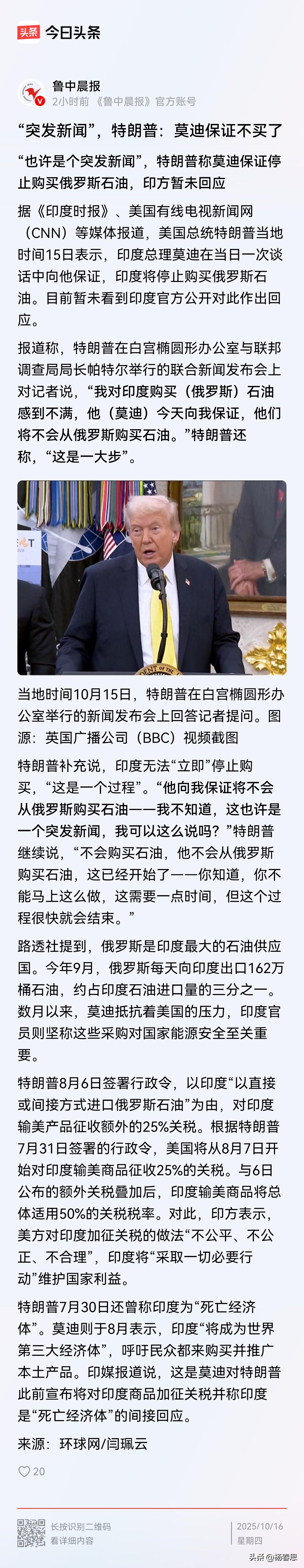 特朗普说莫迪向他保证🇮🇳以后不买🇷🇺石油了,今天又莫迪保证不了。特朗普凭