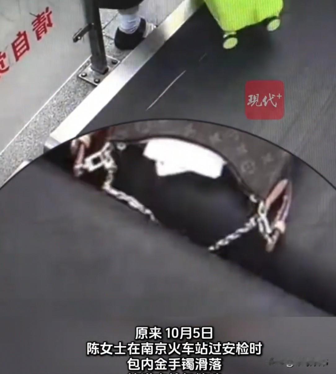 南京,一女子报警称,过安检时90克金镯不见了。民警调监控,清楚看到镯子滑进安检机传送带与机身的夹缝。可赶去现场,缝里空空的,镯子没了踪影。 10月5日上午,南京南站安检口,陈女士拎着包匆匆赶来。 “总算赶到了。”陈女士抹了一把额头的汗,随后把包往传送带上一放,转身就去等行李。 陈女士没有看到,由于她的包拉链没有拉好,传送的时候,里面的镯子掉了出来,滑进安检机传送带与机身的夹缝里。 而陈女士接过行李时,只随意拍了拍包身,见半拉的拉链里没掉出别的东西,便急匆匆往高铁站台赶,压根没察觉镯子已经丢了。 直到10月7日傍晚,陈女士整理行李时才猛地想起:“我镯子呢?” 她翻遍行李箱,突然拍了下大腿——那天图省事,把镯子随手扔包里就没管,拉链还一直半拉着! 冷汗顺着鬓角往下淌,她攥着半开的托特包,指尖捏得发白:“肯定是过安检时,从这半拉的拉链里滑出去了!” 第二天一早,陈女士拎着包冲进派出所,急声道:“警察同志,我90克的金镯子丢了!肯定是10月5号在南站过安检时滑出去的,当时我随手塞包里,拉链都没拉好。” 民警看着她手里敞着的包,立刻明白了缘由,递过一杯热水:“您别慌,包一直是这个状态吗?具体哪个安检口?” 陈女士连连点头,指了指包的拉链:“就这么半拉着,我嫌拉来拉去麻烦……”说着声音就低了下去,满是懊悔。 民警很快调看监控,屏幕里的画面清清楚楚:陈女士的包半敞着拉链,金镯在传送带上晃了两下,直接从开口处滑出,掉进了夹缝。 “就是这儿!”陈女士凑过去,盯着屏幕里那枚消失的金镯,肠子都悔青了,“都怪我太随意,拉链也不拉紧……” 可当两人赶到安检口,民警蹲下身用手电筒照向夹缝时,里面却空空如也。 “这怎么会……”陈女士的声音发颤,手不自觉地把半拉的包拉链捏得更紧。 好在民警很快从后续监控里找到线索——10月5日中午,一保洁阿姨清洁时,从夹缝里拿出了那只金镯。 民警很快找到保洁阿说明了来意。 保洁阿姨一听是镯子的失主,爽快地拿出了镯子,说:“我那天找到的时候,在周围喊了半天失主,都没人就自己收起来了,现在物归原主。” 陈女士攥着失而复得的金镯,立马跟保洁阿姨道了声谢。 随后,她忙把包的拉链拉到最顶端,死死扣紧:“以后再也不这么马虎了,贵重东西得放好,拉链也绝不能半拉着!” 陈女士图省事,拉链半拉、镯子乱塞,这不就是“大意失荆州”嘛。好在遇上实诚保洁和细心民警,金镯才找回来。 说到底,出门别嫌麻烦,贵重东西盯紧点,小仔细换大安心,多值!