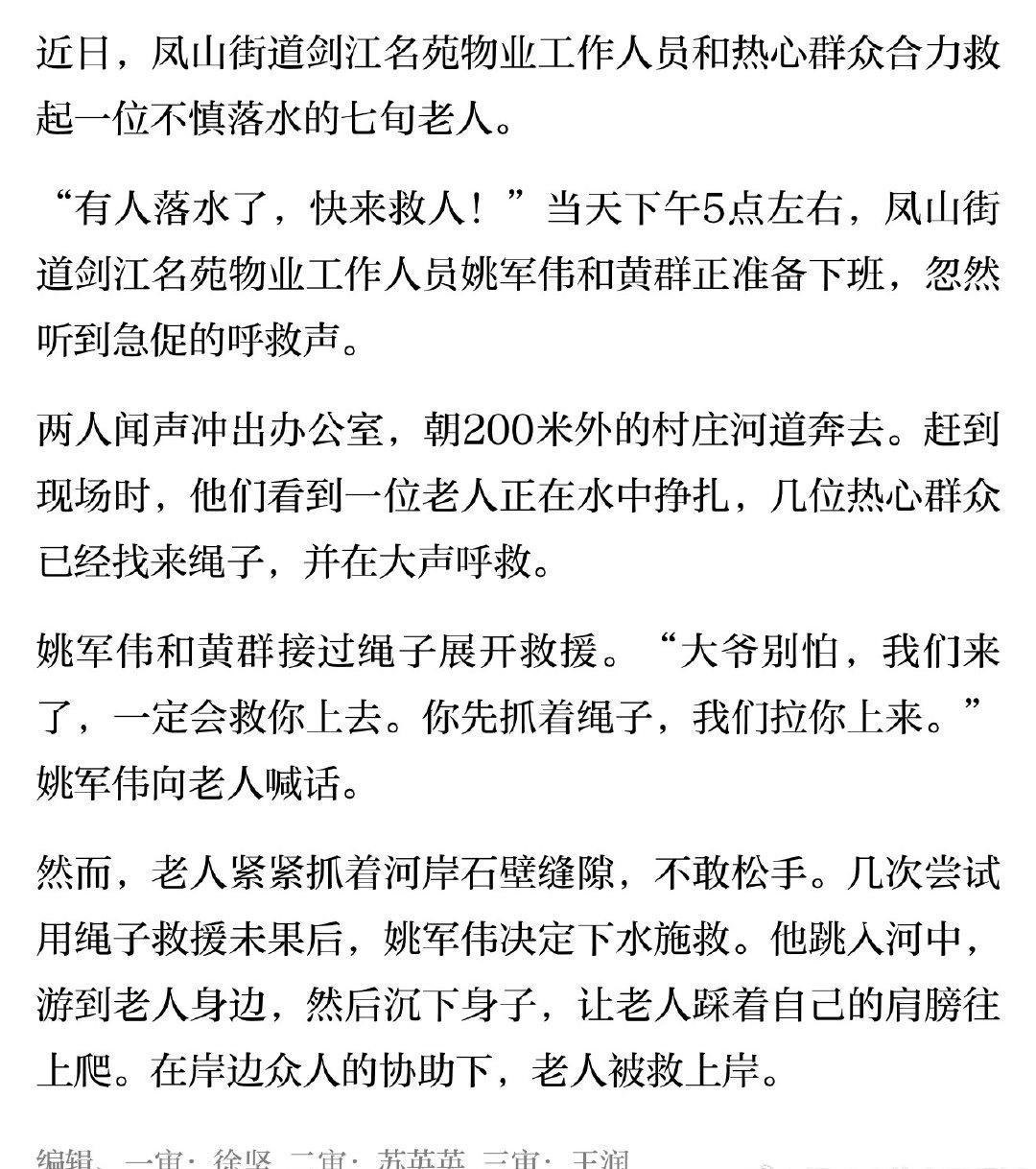 近日,宁波余姚,凤山街道剑江名苑物业工作人员姚军伟、黄群与热心群众合力救起一位落水七旬老人。 当天下午5点左右,准备下班的姚军伟和黄群突然听到“有人落水”的呼救声。两人立即冲向200米外的河道,发现一位老人正在水中挣扎,几位群众已找来绳子施救。 姚军伟向老人喊话安抚,尝试用绳子救援,但老人因害怕紧紧抓住石壁缝隙不敢松手。几次失败后,姚军伟果断跳入河中,游到老人身边,让老人踩着自己的肩膀,在岸边众人合力协助下,成功将老人救上岸。