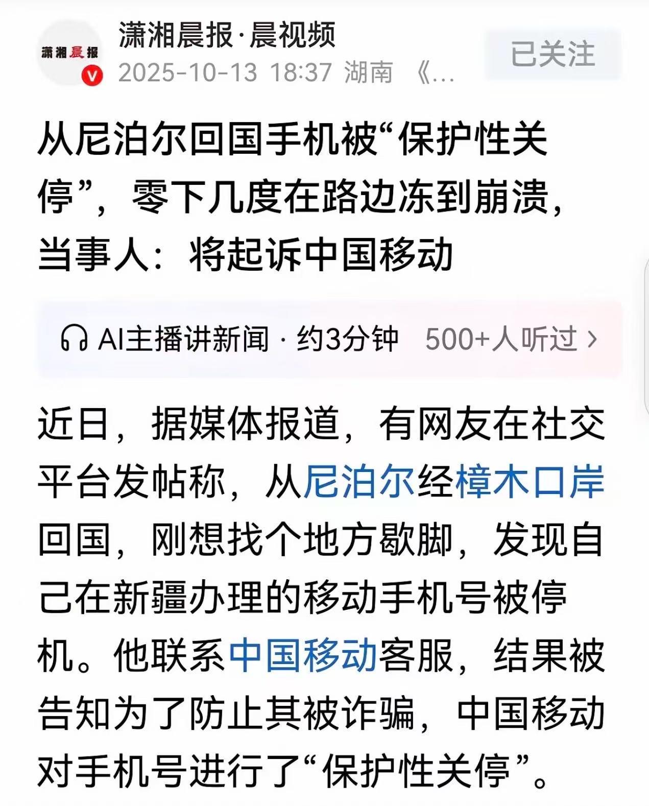 太离谱了!男子从尼泊尔回国,手机突然停机,他以为欠费就充了200元,可还是没有信号,于是联系移动客服,客服却说:为了防止你被诈骗,对你的手机号进行了“保护性关停”,想要开机必须去移动厅办理!男子:让我在零下几度,身无分文冻到崩溃! “口口声声担心我遭遇诈骗,却丝毫不顾及我的生命安全,这实在是太气人了!在我没欠费的情况下,他们有什么权利擅自把我的手机停机!” 李先生满心愤怒,声音因激动而微微颤抖,那股子憋屈劲儿仿佛要冲破胸膛。 当时,天空正飘着鹅毛大雪,凛冽的寒风如刀割般刮在脸上,气温早已降至零下。 李先生仅仅穿着一件单薄的冲锋衣,在冰天雪地中瑟瑟发抖。更要命的是,他口袋里没有多少现金,手机被莫名停机,无法使用手机支付,简直是寸步难行! 他怀着最后一丝希望,反复央求客服:“我现在情况特别糟糕,能不能先给我开4个小时的网络,让我先找到个住处,不然我真的会冻坏的。” 客服一开始百般推脱,在李先生再三恳求下,才勉强同意。可谁能想到,仅仅5分钟之后,网络又无情地关掉了。 李先生赶忙再次联系客服,第二个接线员却态度强硬,直接拒绝开通,仿佛李先生的艰难处境与他们毫无关系。 走投无路的李先生,只能无奈地向警方求助。在警方的帮助下,他暂时有了个落脚的地方。随后,他马不停蹄地在当地找了一家营业厅,满心期待着能开通手机,恢复正常的通讯和生活。 然而,营业厅工作人员的一番话,却如同一盆冷水,将他最后的希望浇灭:“你这是新疆的手机卡,我们这儿没办法办理,你只能回新疆去开通。” 可此时,李先生身处西藏的日喀则聂拉木县,与新疆相隔千里之遥,这谈何容易? 无奈之下,为了能尽快解决眼前的困境,李先生只能咬咬牙,重新办了一张电信卡救急。 可即便如此,直到10月13日,那张被停机的手机卡依旧没有解封。 这张卡李先生已经使用多年,里面存储着大量的联系人信息和工作资料,放弃它无疑会给生活和工作带来诸多不便。但此时,李先生实在是忍无可忍,最终决定弃号。 他满心愤懑,向移动公司提出了合理诉求:要求移动给出强制停机的依据,退还200元话费,并承担他因手机停机而额外产生的交通费。 移动客服当时信誓旦旦地承诺48小时内给出答复,可一周过去了,却如同石沉大海,没有任何回应。 在李先生看来,移动公司这种不顾他身处险境、强行停机的行为,简直是对他人身安全和基本权益的漠视。原本精心规划的旅行行程,也因此被搅得一团糟,美好的旅行体验荡然无存。 当记者就此事向移动客服求证时,客服却给出了这样的解释:“李先生在新疆办理的手机卡,没有开通跨省业务,所以在西藏地区无法直接办理开机,只能回到新疆的营业厅去处理。” 此事引发了热议,有网友说, 我是河南的,一个号用了十几年,一天国没出过,来山西打工,刚转个陌生地方,给我突然停机,怎么都不能开,非要让到原籍办理,身无分文,一人不识,欲哭无泪,绝望到抓狂,用别人电话联系家里让订了高铁票,步行十几里到车站,一天一夜未吃,仅靠水维持,下车后又步行十多里,大冷天早上在营业厅外等了两个多小时,等开了门却百般刁难,又是要公安局证明,又是要单位材料,一个刚到外地打工的人怎么能拿出单位的证明材料,求爷爷,告奶奶跑了一天,到快天黑才给开通,全村人都笑我成了诈骗犯,从此改卡,移动只保号,因为用了十几年,拆腾这一趟,连来回车费带工作毁了一千多,一年的电话费打了水漂,受的罪和气,这辈子都不会忘! 也有网友说,我妈妈也试过,一个农村的老太太新开的一个号,用了不到一个月就停了,还以为没钱,充了200块钱进去还是提示停机,最后打电话到10086提示是防诈骗,让我们必须回到开户地解锁,我又带着妈妈回老家把手机解绑,但解绑了不到三天又给锁上了,真不知道这是什么依据。新开的号说是诈骗号,那既然是诈骗号,为什么还要放出来给别人开通呢? 还有网友说,电信也一样,在瑞丽旅游,在一国两寨,这边是中国,另外一边是缅甸,莫名其妙说我的手机有诈骗嫌疑,强制性关机,必须回入户所在地办理。,怎么打电话都没办法帮助开机…… 从移动公司的角度来看,他们声称“保护性关停”是为了防止用户遭遇诈骗,出发点或许是好的。 但在实际操作中,却完全忽略了用户的实际处境和紧急需求。在当今这个数字化时代,手机已经成为人们生活中不可或缺的一部分,关乎着通讯、支付、导航等方方面面。 移动公司在未充分核实情况、未提供有效应急解决方案的情况下,就贸然停机,这种做法实在欠妥。 它不仅给用户带来了极大的不便,更有可能让用户陷入危险的境地。理论上很有可能因为此原因导致李先生无法手机支付,身上又没有钱,然后在严寒下冻死。 企业追求安全防范的同时,不能以牺牲用户的基本权益为代价。希望移动公司能从中吸取教训,改进服务流程,真正做到以用户为中心,而不是让“保护”变成“伤害”!