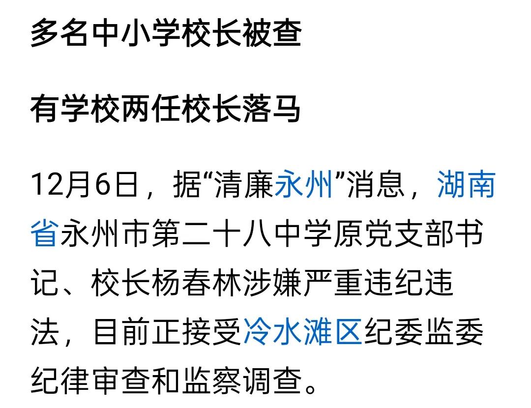 老师群体在社会上越来越多的受到质疑,跟这些校长被查离不开关系。 看看这些报道的这些新闻,全国各地都有不少中学校长被查。 在不少人看来,连校长都能到这个地步,那这些学校的老师们是不是也有一些问题? 第一,中学校长一般都是老师出身。 教育局的领导一般都是行政干部,但是中学校长一般都是学校老师出身。 这些老师当了校长以后就变成了这等模样,实在是令人感慨。 这可能也从另外一个层面说明,校长的权力受到监督,受到制约比较少。 否则在于刚开始出现问题苗头的时候,可能就会及时得到解决,及时进行处理,不至于到后来犯下这么大的过错。 这些落马的校长,这一辈子基本上也就交代了。 第二,这些校长落马也充分说明,在学校里面存在着利益空间。 以前总觉得学校是一个清水衙门,但是目前来看这么多校长接连被查,说明学校还真有可能是一块大肥肉。 而且这大肥肉肥的流油,让很多人见了都忍不住咬上几口。 普通老师可能接受不到,但对于一个校长来讲,一个学校上千人甚至几千人,存在着非常大的利益操作空间。 也就是说,在中学阶段,学校存在着某些灰色地带。而那些自以为是的校长,就出色能把这个灰色空间利用起来。 校长原本应该带领学校的全体教师,全体学生奔着更好的未来而前进的,现在校长却变成了一个阻碍学校发展的石头,甚至在网络上成了负面新闻的代名词。 可悲可叹!