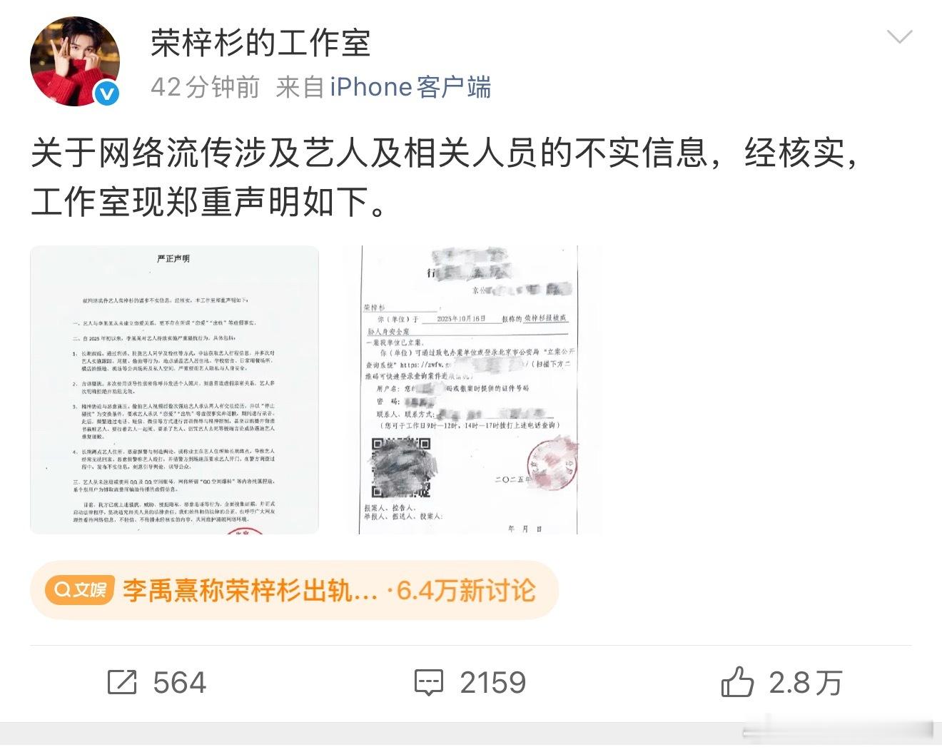 荣梓杉工作室发声明,称荣梓杉和李禹熹两人“从未建立恋爱关系”,并称李禹熹对荣梓杉